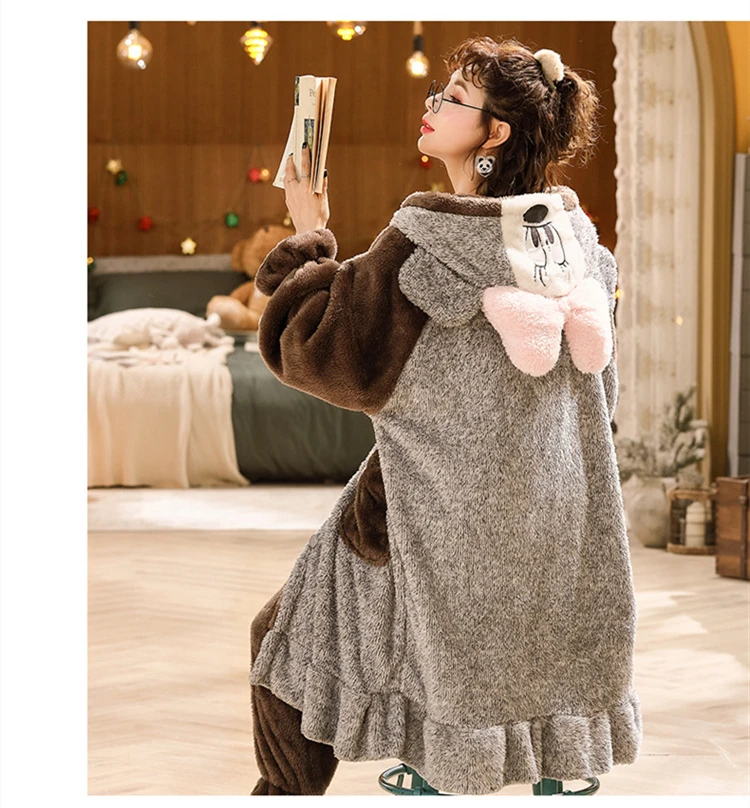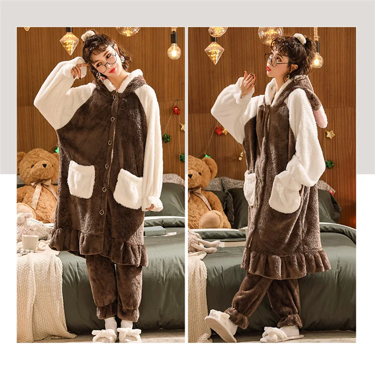 Зимние домашние теплые фланелевые ночные рубашки, комплекты для женщин с милым мультяшным капюшоном, плотное Ночное платье для девочек, домашняя одежда для сна для женщин, комплекты из 2 предметов