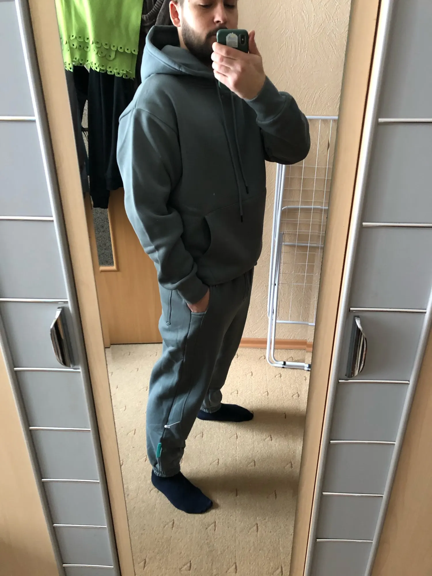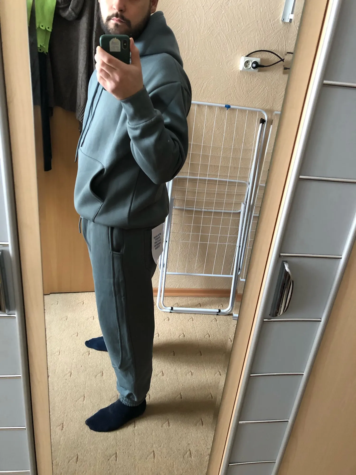 Толстовка шикарная, толстая на флисе, выглядит дорого. Параметры мужа - рост 182, вес 76 кг, широкие плечи и длинные руки. Часто проблема с рукавами, они короткие, здесь всё село идеально, чуть с запасом. К покупке рекомендую. Штаны этого же размера XL оказались коротковаты, ниже есть отзыв.