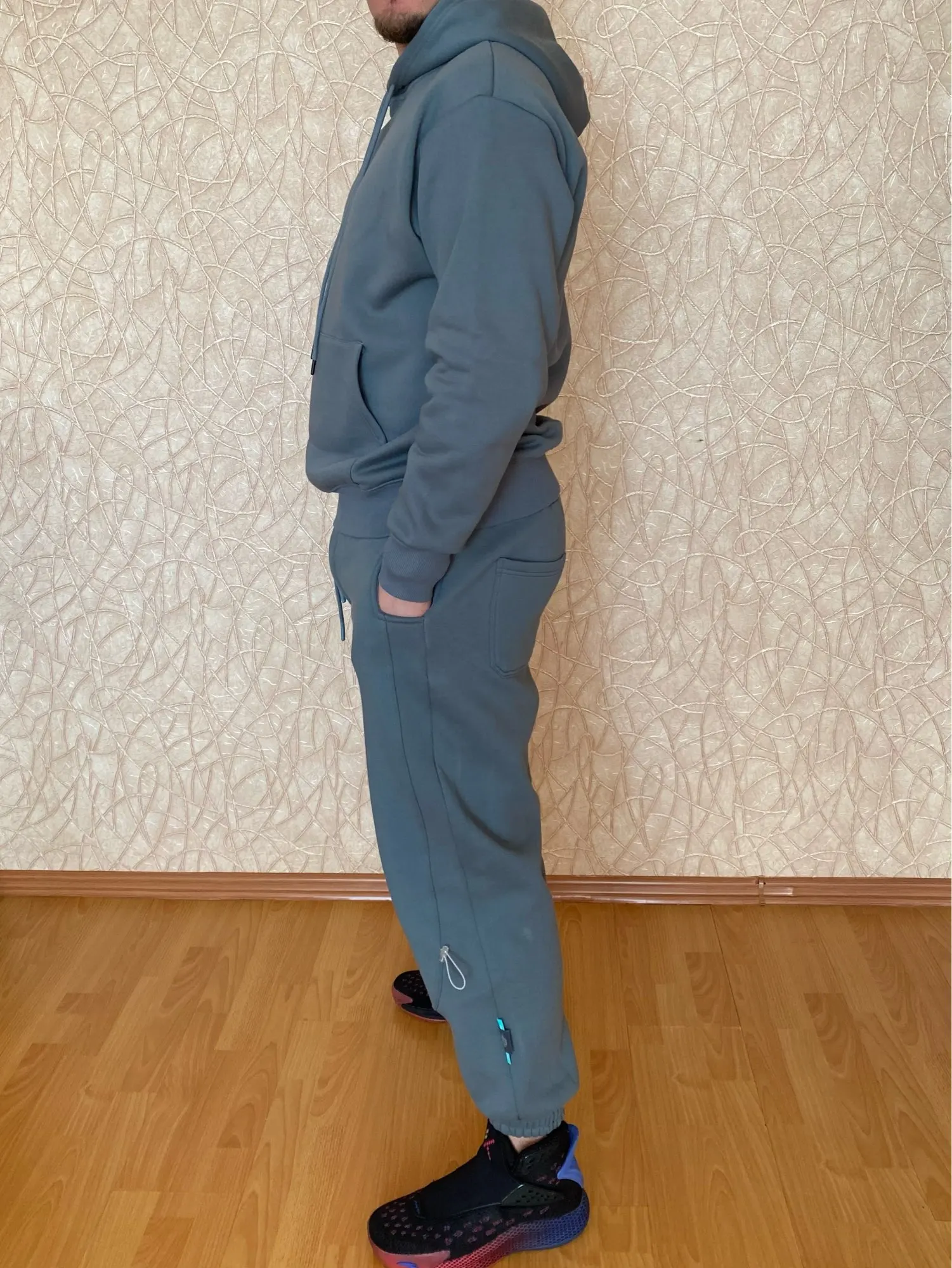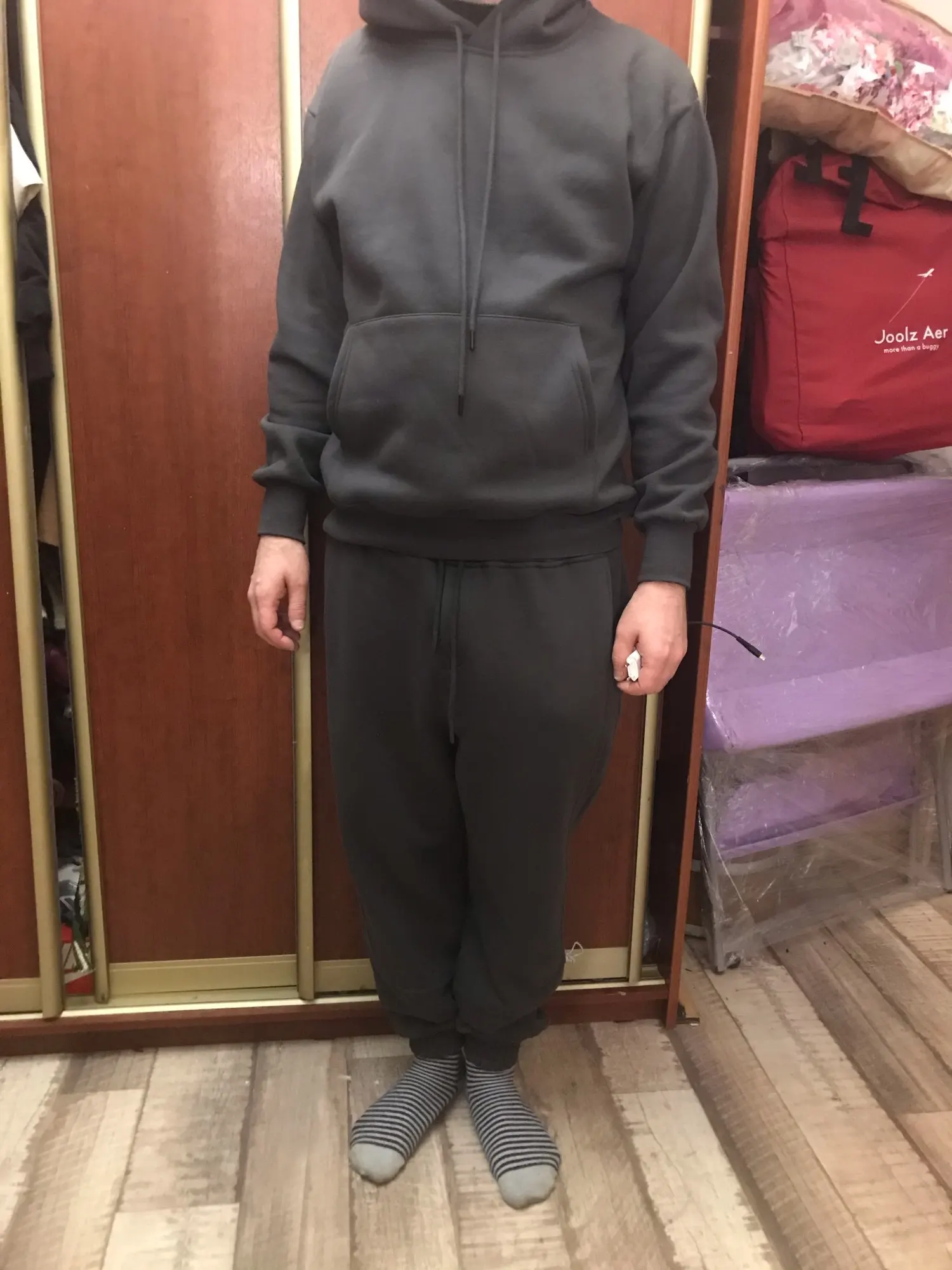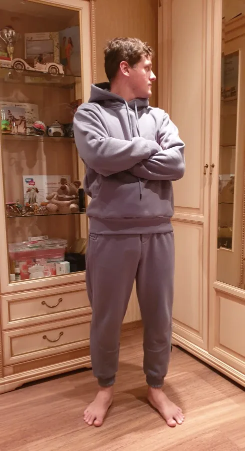 костюм пришёл очень быстро, за 1.5 недели до Москвы, по совету продавца заказал размер М, на параметры ог100 от88 об 104 рост 173 см подошёл идеально, не в обтяг, в меру свободно. Длина брюк в самый раз, без запаса. Качество отличное, все строчки ровные, нитки не торчат, запаха нет. И худи и штаны тёплые на флисе, удобные. фото цвет не передаёт, в реале он голубосерый. Рекомендую! Спасибо!