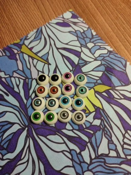 Набор глазок - полушария. Общий размер одинаковый, а зрачки разного диаметра. Цвет радужки: зелёный, серый светлый, серый тёмный, голубой, коричневый, чёрный. сиреневый. Подходят для кукол 116 см. Продавца рекомендую.
