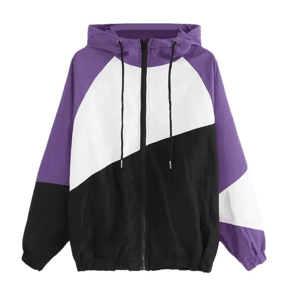 Женская Лоскутная тонкая спортивная куртка с длинным рукавом и капюшоном на молнии