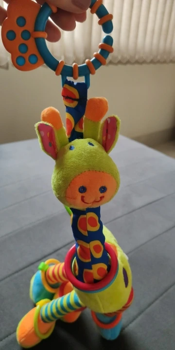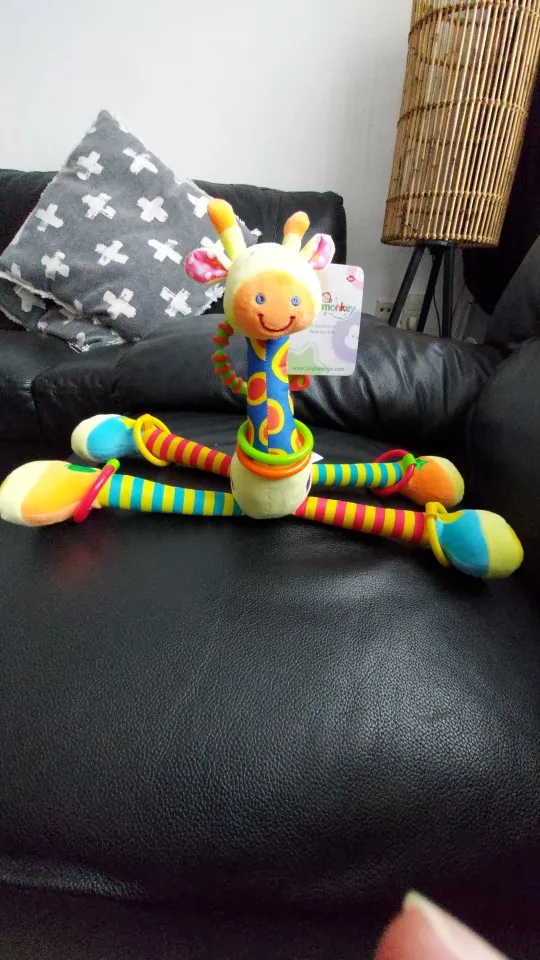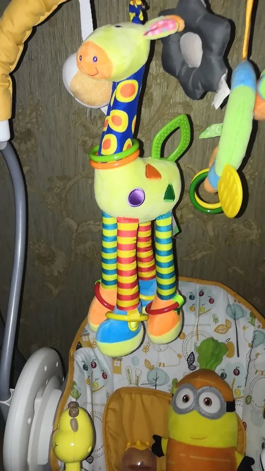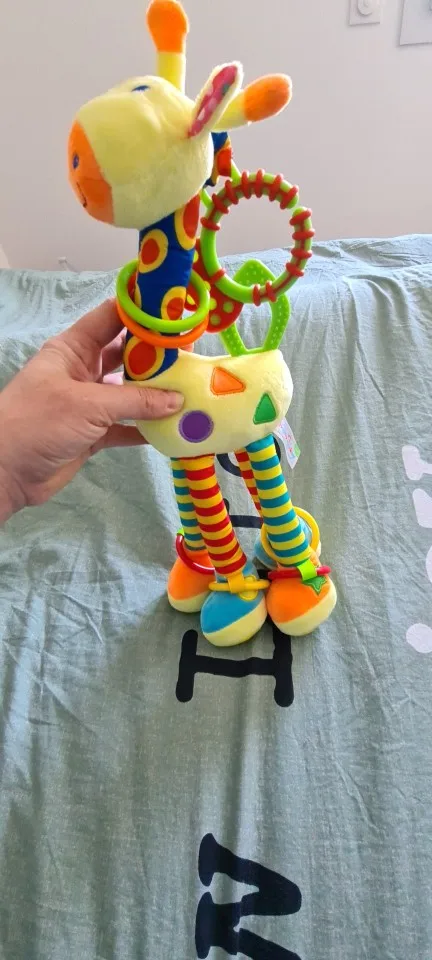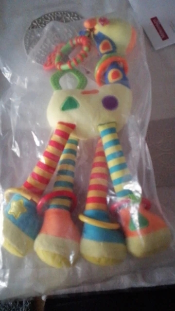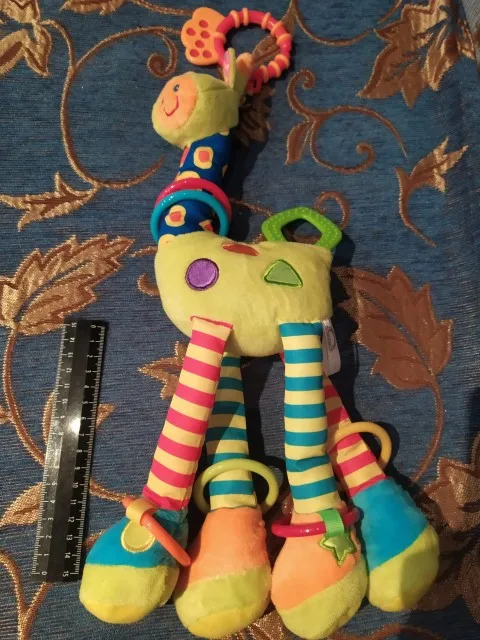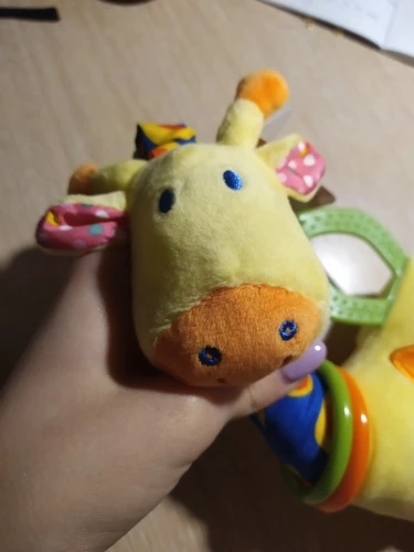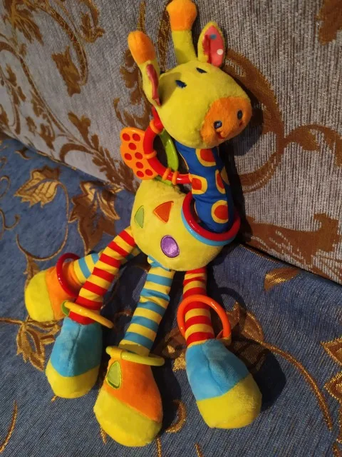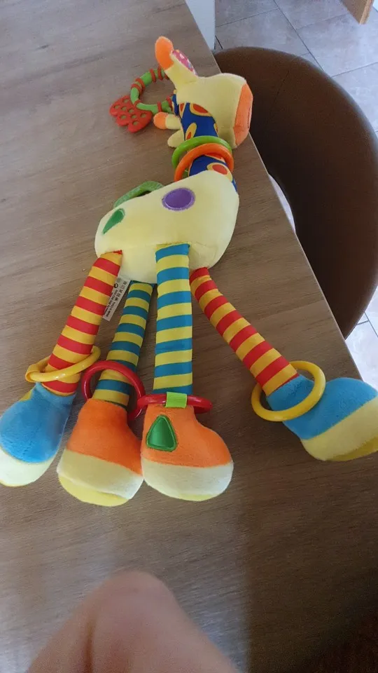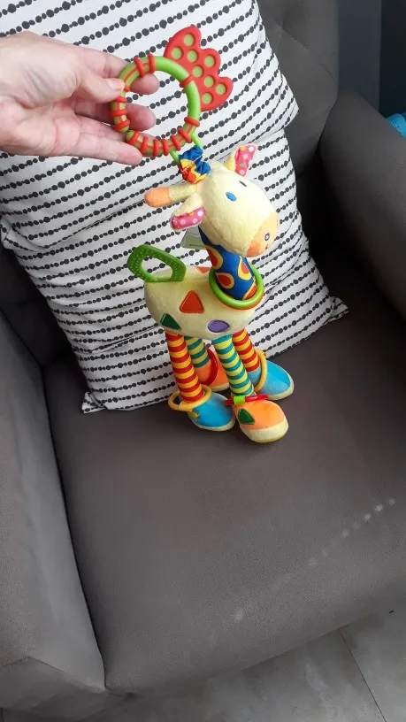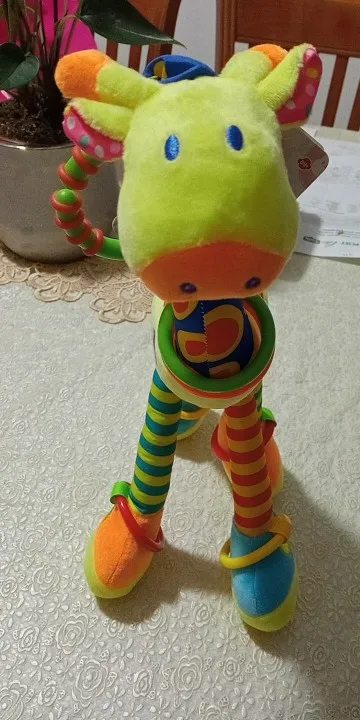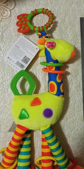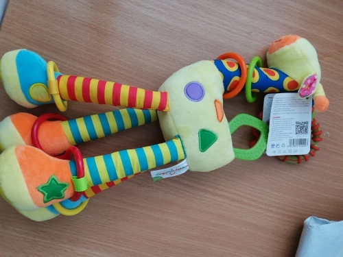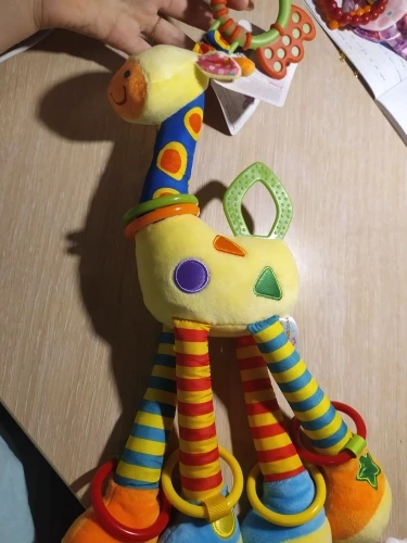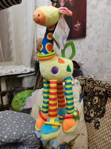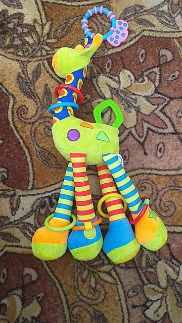 Хорошая яркая игрушка. Посторонних запахов нет, нитки нигде не торчат. Колечки на шее гремят, когда стукаются друг о друга, в ножках шуршащий наполнитель.