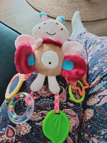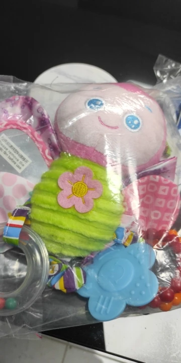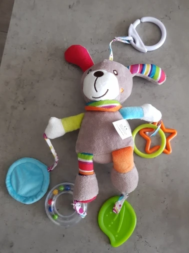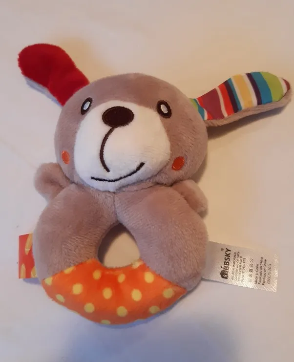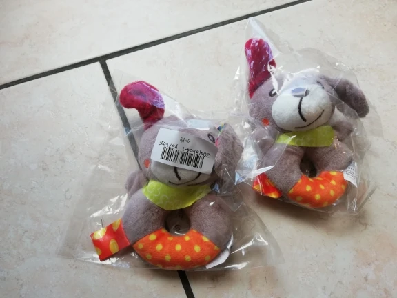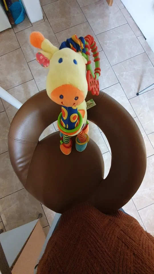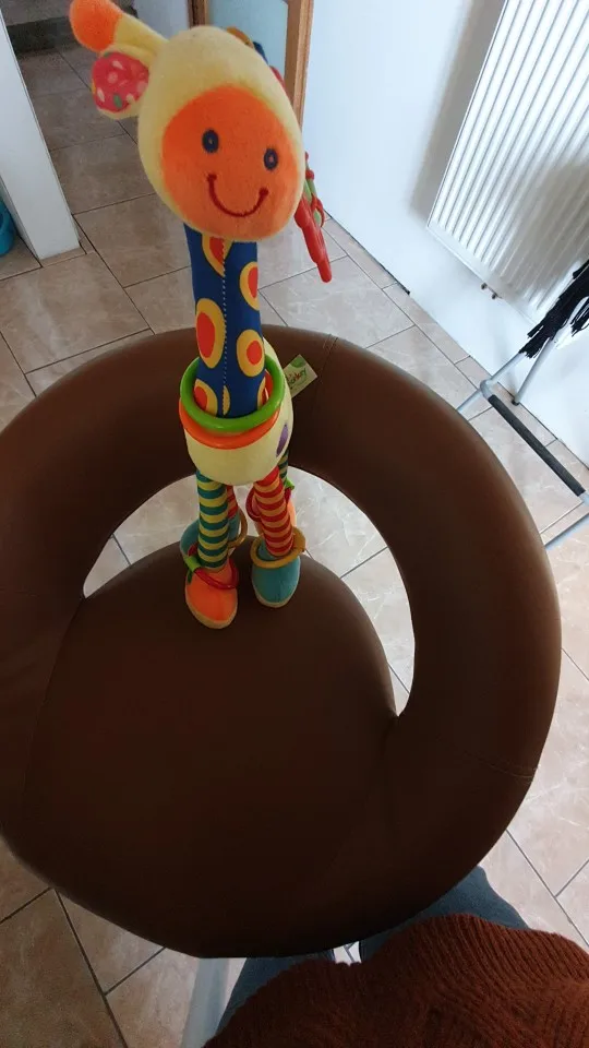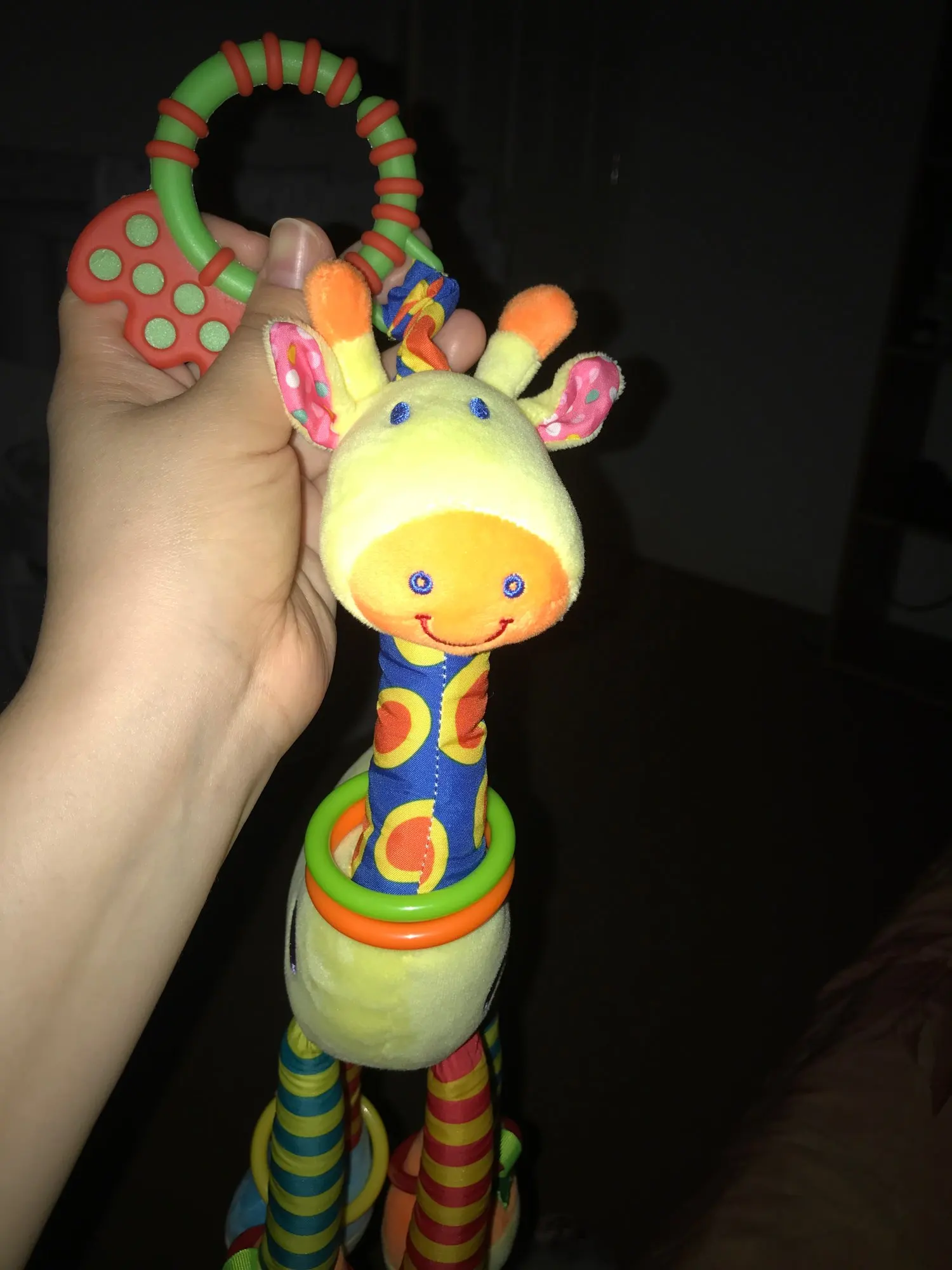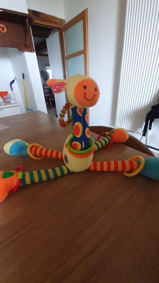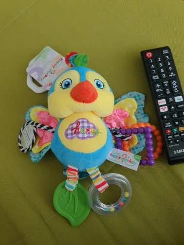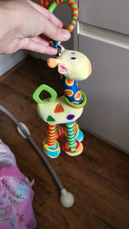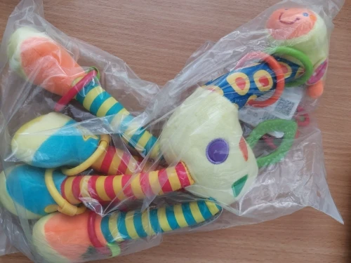 Хорошая яркая игрушка. Посторонних запахов нет, нитки нигде не торчат. Колечки на шее гремят, когда стукаются друг о друга, в ножках шуршащий наполнитель.