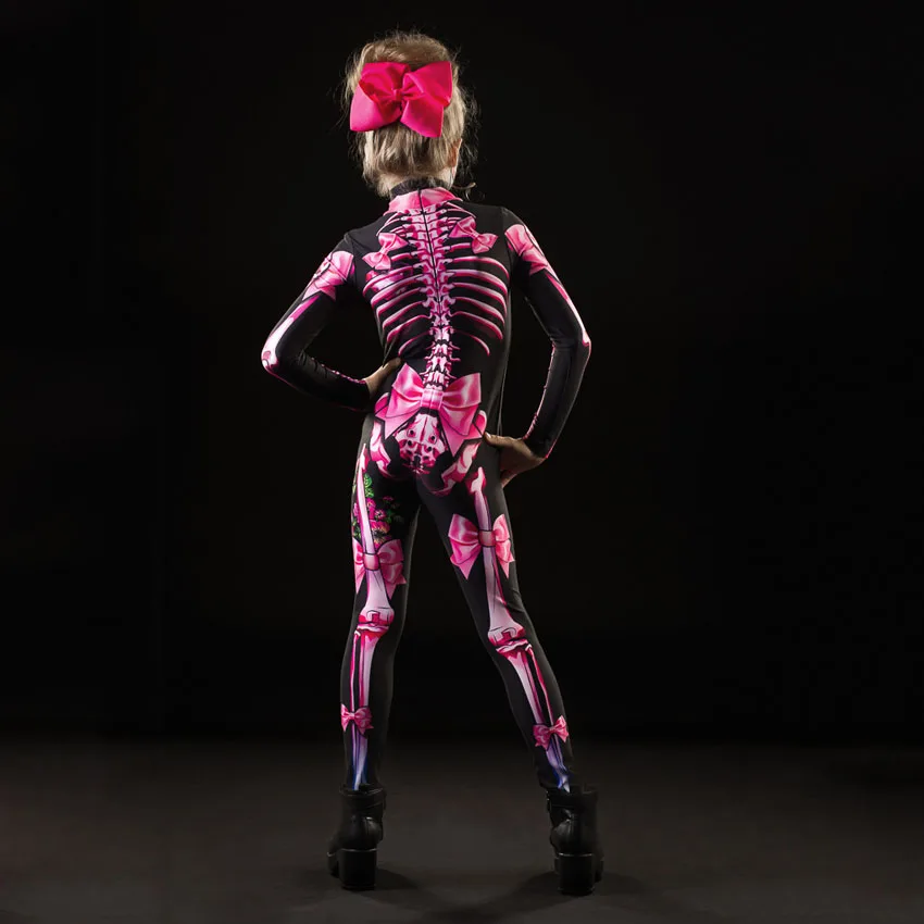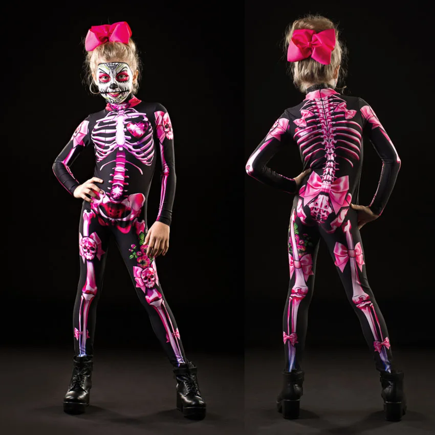 Женские костюмы на Хэллоуин, комбинезон, соблазнительный страшный костюм с черепом для взрослых, мамы, дочери, скелета, косплей, боди с розовым принтом