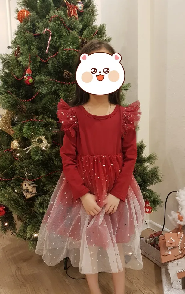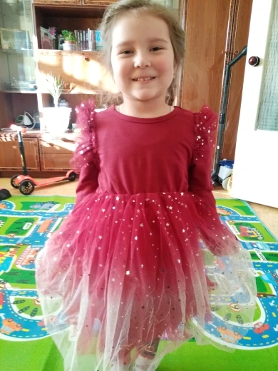 Отличное платье. Качество хорошее, трикотаж плотный, юбка пышная. Размерная сетка соответствует. На 6-летнюю девочку среднего телосложения ростом 116-122 см размер 7 с запасом. Свободно сверху и длинные рукава. По длине как на фото продавца получилось.
