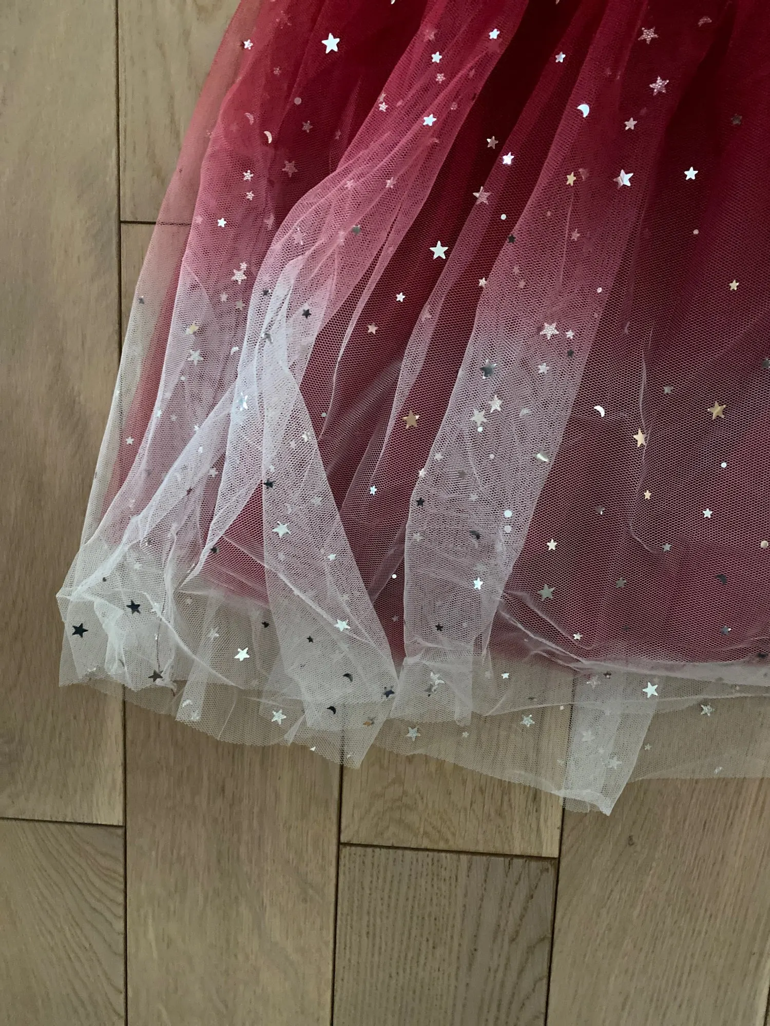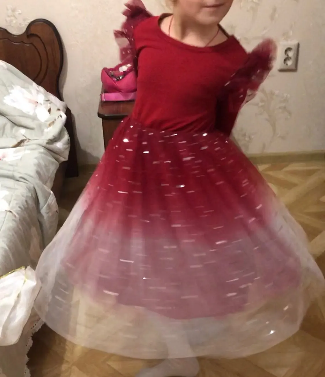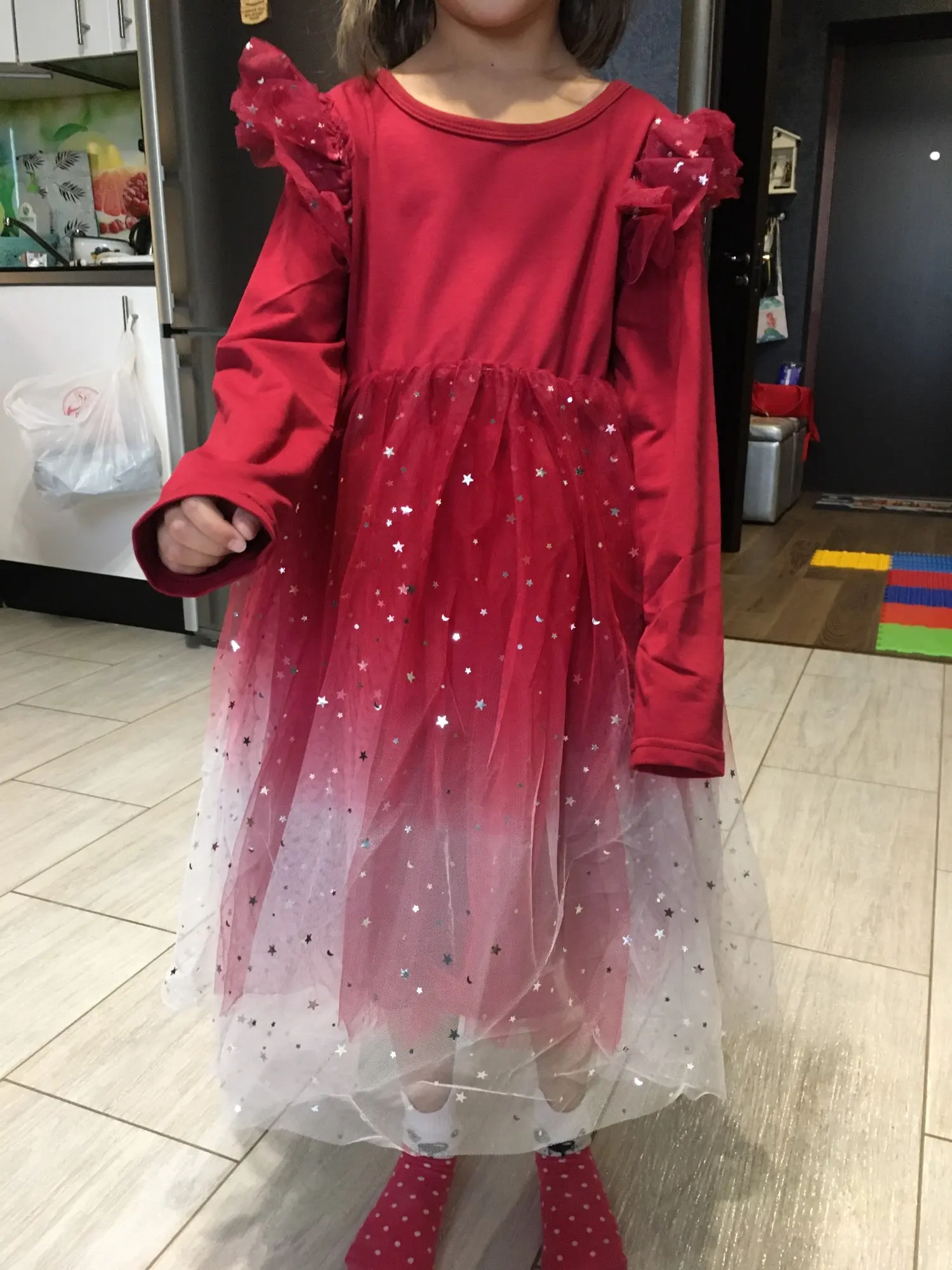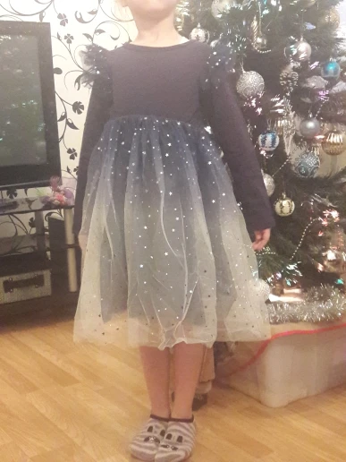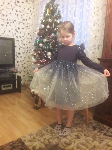 Потрясающее, блестки переливаются волшебно!Довольно пышное даже без подъюбника)))у дочи рост 120 , на этикетке платья написано 140. Слегка великовато, вот прям чуть-чуть в рукавах, но не критично!Сидит хорошо, еще год думаю будет носить)Покупкой довольны!Товар в Сочи шел 23 дня!