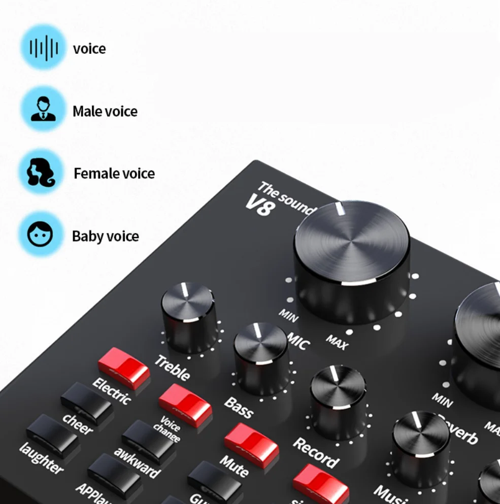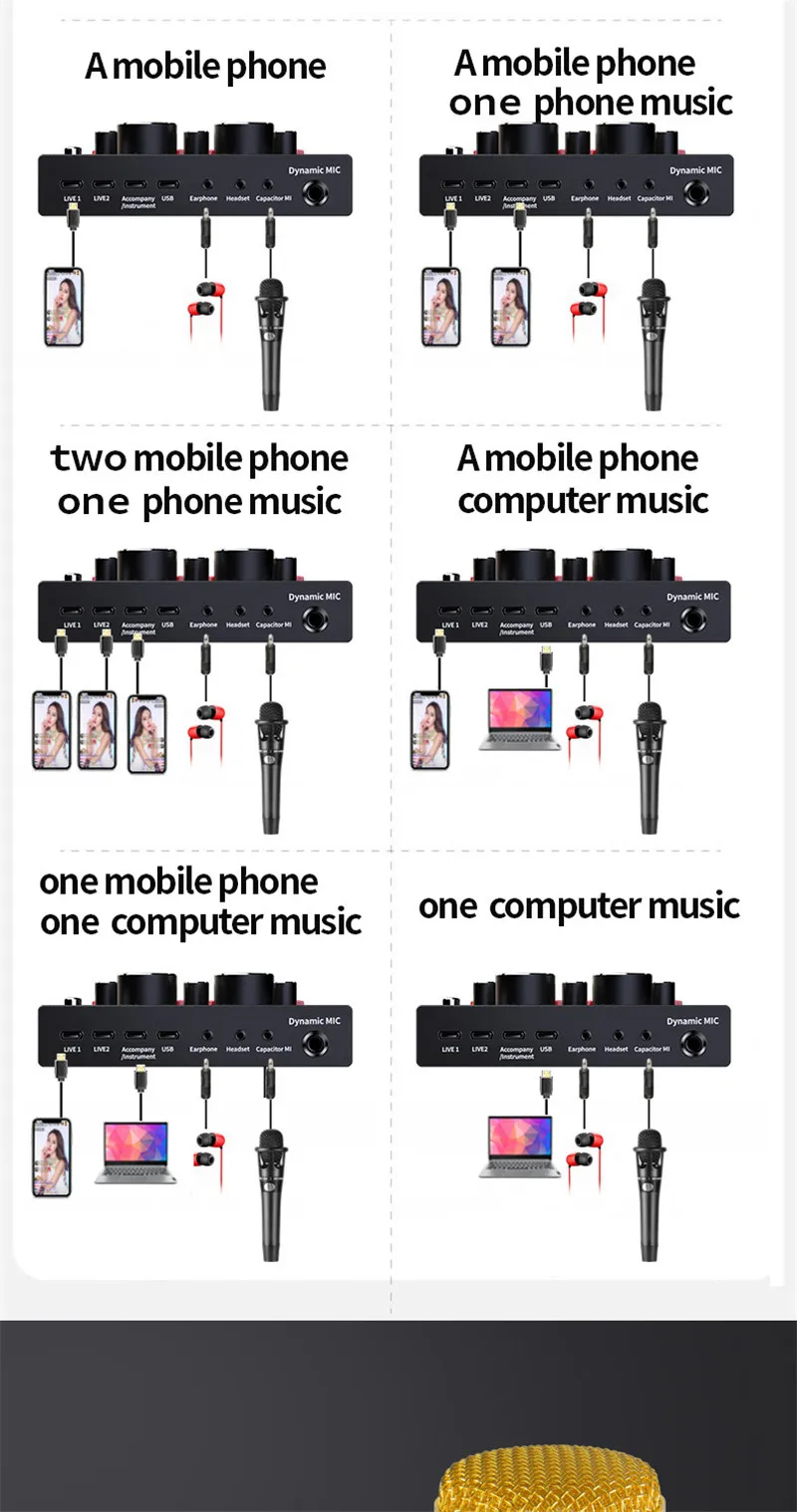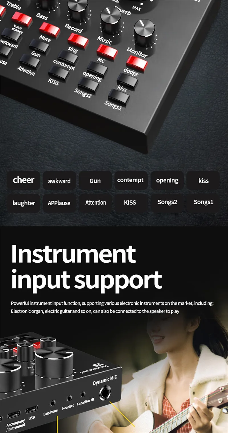 1. Регулировка громкости микрофона 2. Регулировка реверберации 3. Высокие басы Alto сопровождение мониторинг цифровой регулировки 4. Одна кнопка отключения звука 12 видов электро-акустического режима 4 вида режима акцента (мужская женская кукла старика) 5. Режим выкрикивания одним щелчком 6. Режим dodge с одной кнопкой 7. Всплывающие крики, режим пения пшеницы 8,12 видов живых спецэффектов свободно переключаться (смех аплодисменты выстрелы открытия обрядов, пожалуйста, обратите внимание на обряд ура поцелуев хвалю презрение Ворон) 9. Вы можете использовать большое аудио оборудование для одновременного использования двух мобильных телефонов. Музыкальные инструменты, гитары, клавиатуры и другие сопровождения.