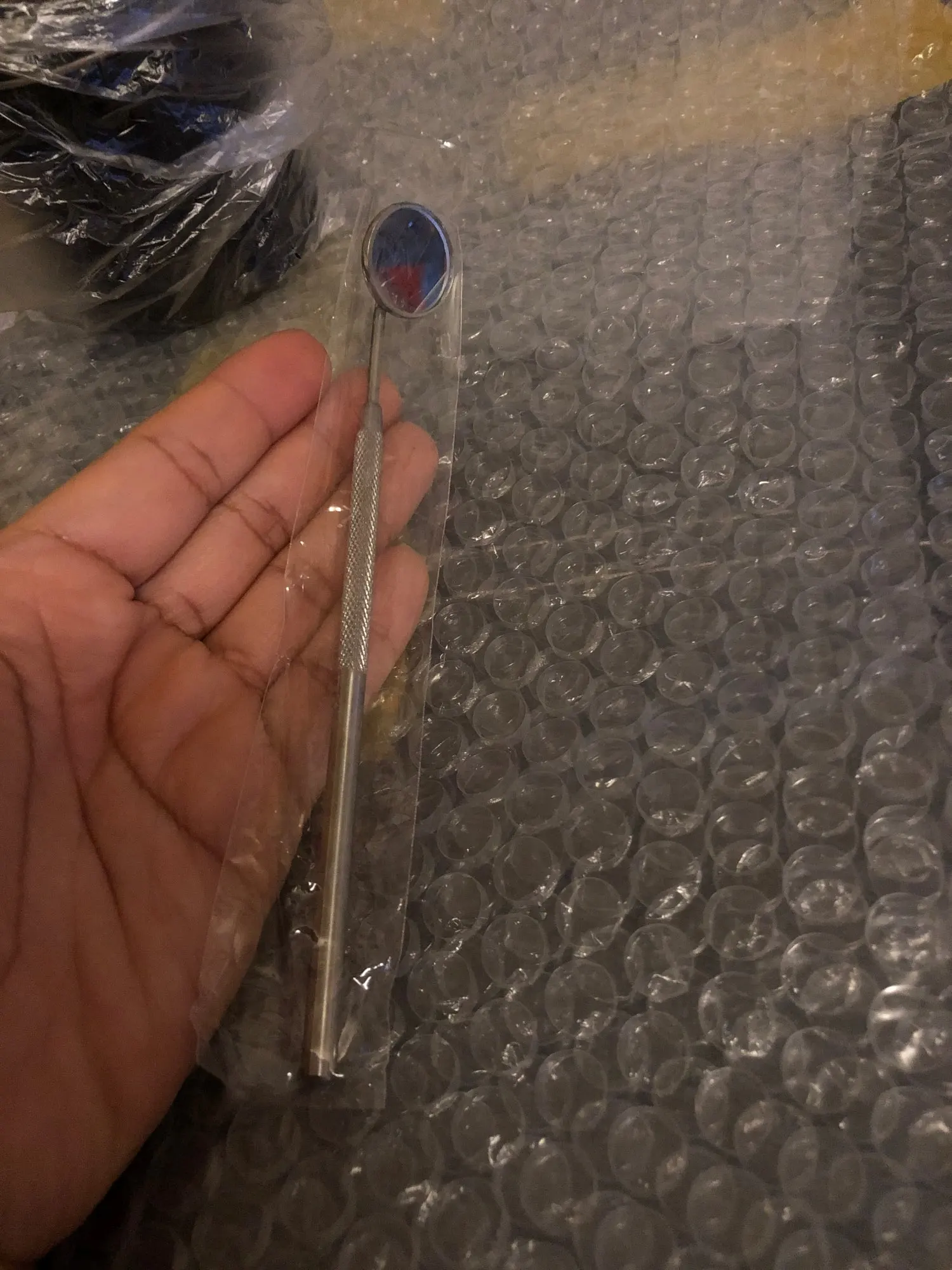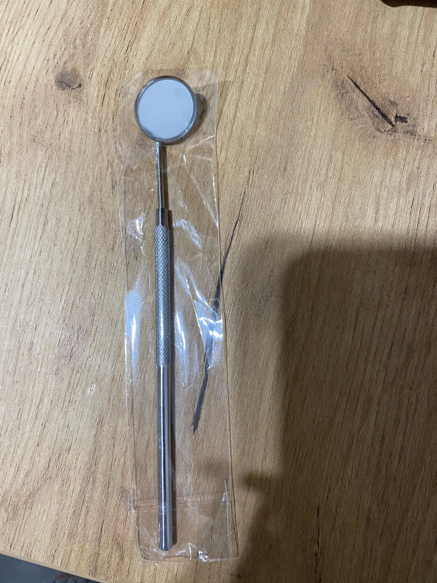 Шло более месяца. Описанию соответствует. Зеркало может откручиваться от ручки, наверно для других инструментов универсальная ручка. Металл.