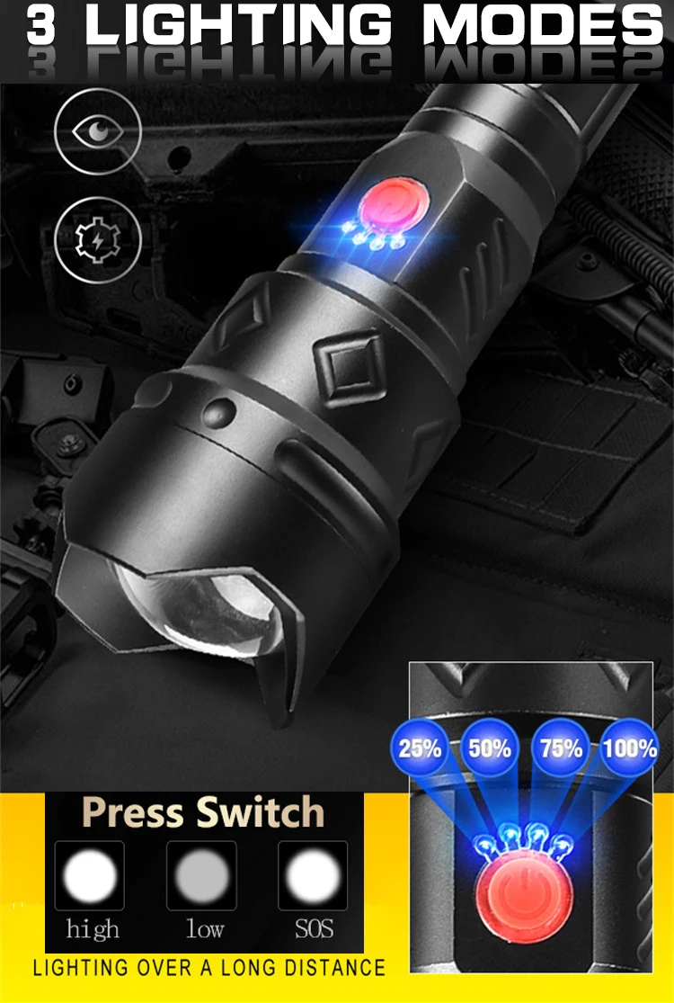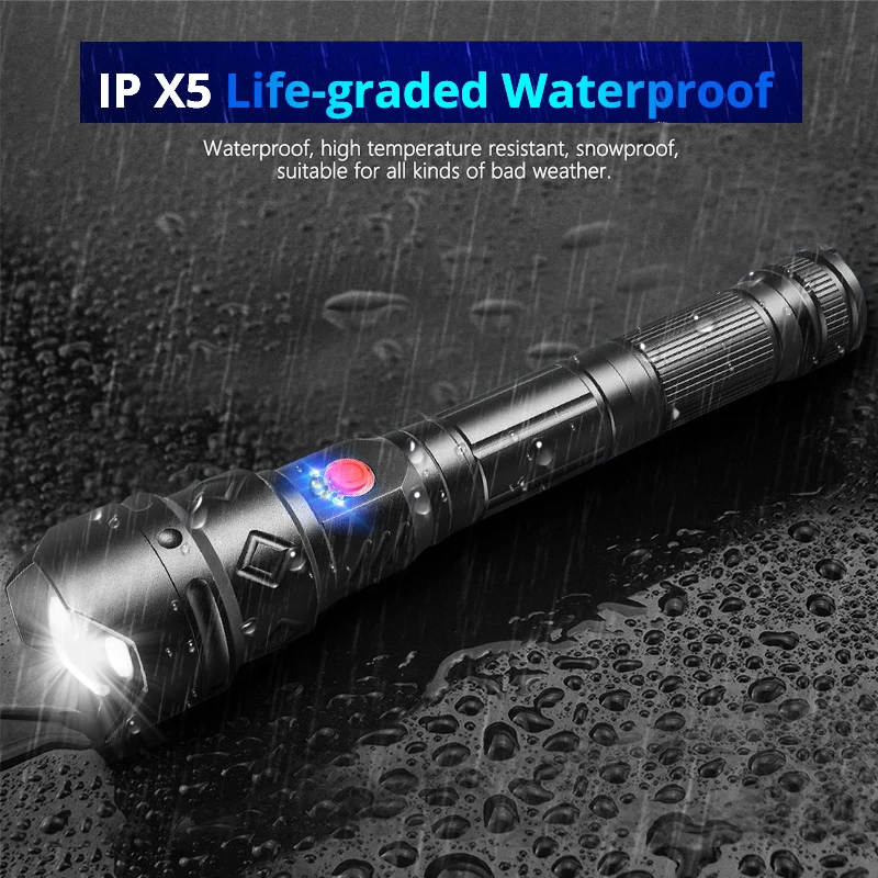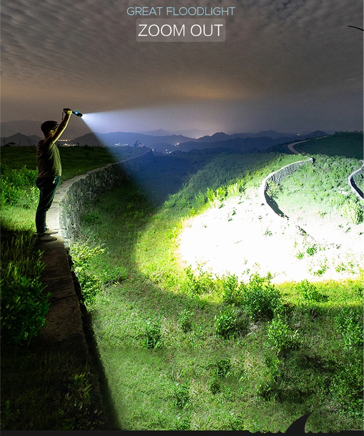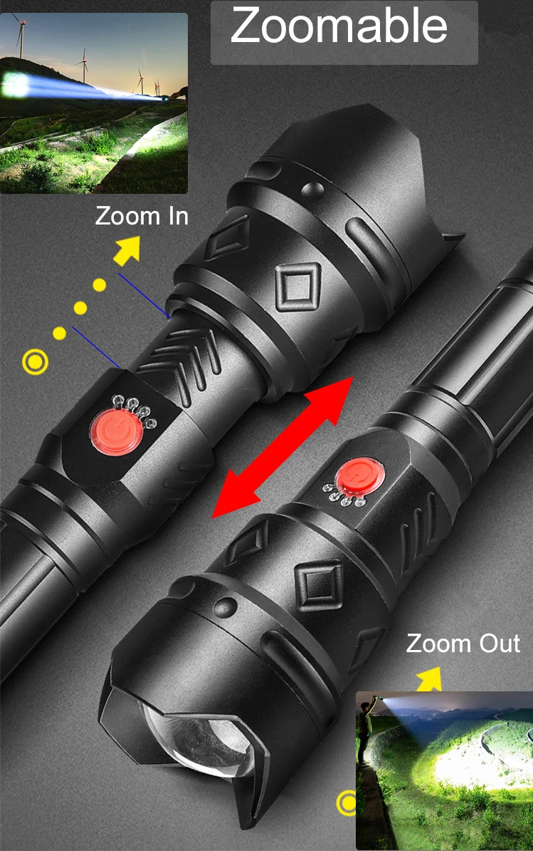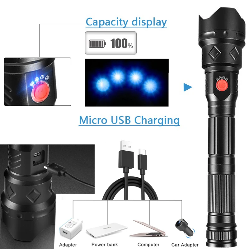 Мощный светодиодный фонарик с использованием лампы XHP70.2 светодиодный фонарь с максимальным выходом до 8000 люменовУвеличьте 2*18650 или 2*26650 аккумуляторный отсек, чтобы увеличить время работы.Дисплей емкости аккумулятора, телескопический зумМикро-usb для компьютера usb, Автомобильный USB, usb-разъем для зарядки, зарядный фонарикИзготовлен из авиационного алюминиевого сплава прочный HAIII военный класс Жесткий анодированныйВодонепроницаемый в соответствии с IPX-5, водостойкий, может использоваться в дождливую погоду, но не может положить его в водуПодходит для работы, охоты, альпинизма, рыбалки, кемпинга и активного отдыха и т. д.Ударопрочный до 2 метров