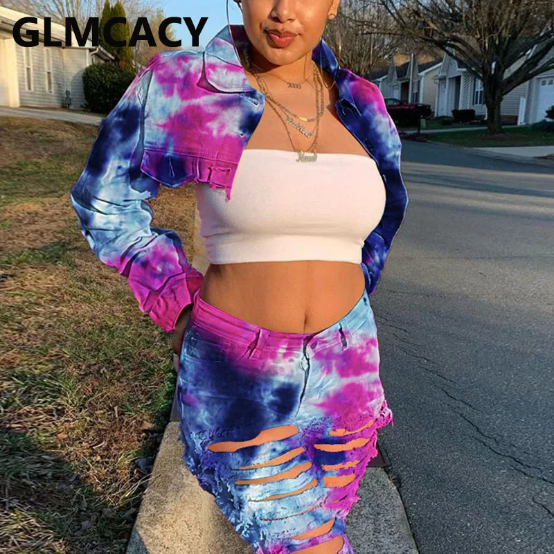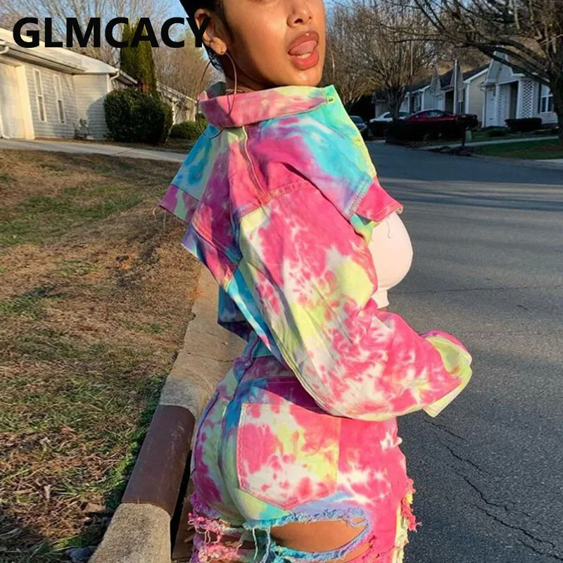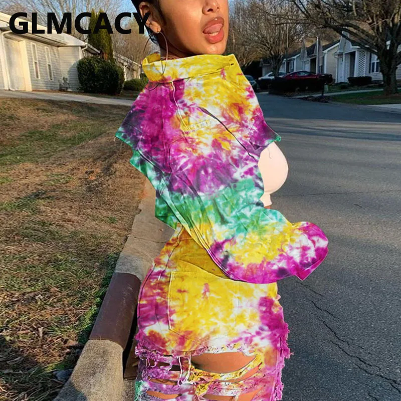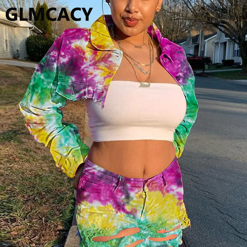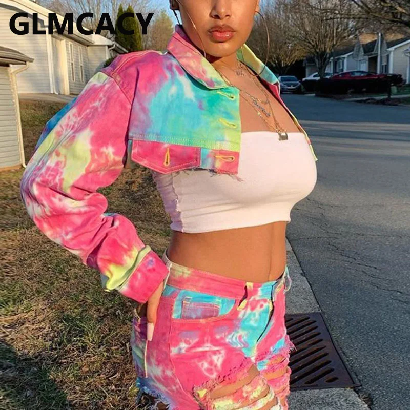 Женская джинсовая укороченная куртка с принтом в виде галстука-красителя и длинным рукавом, шикарное короткое пальто