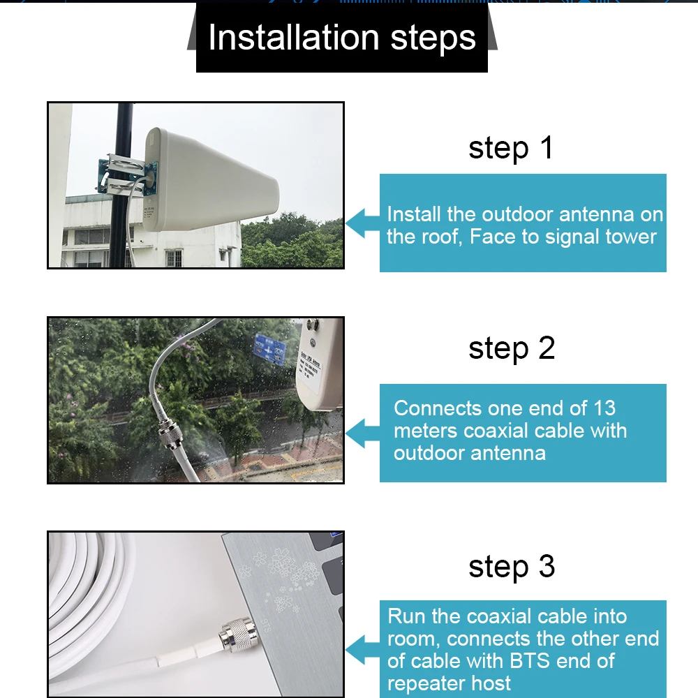 1. Повторитель 900/1800/2100/2600 2. Наружная антенна 3. Внутренняя антенна 4. Кабель 13 метров 5. Разъем питания.