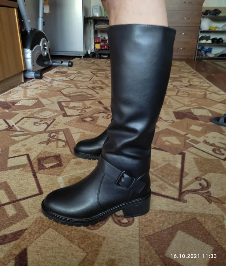 Третья пара сапог из этого магазина, мягко говоря, разочаровала. На ноге сидят фигово, в районе щиколотки и чуть выше пузырём прям. По размеру на 39 с теплым носком нормально будет, на колготки свободно (слишком). В общем, по слякоти носить буду, но удовлетворения покупка не принесла.