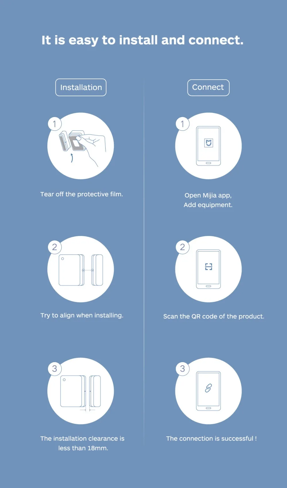 -Установка:1. Оторвите защитную пленку.2. Попробуйте выровнять при установке.3. Зазор установки составляет менее 18 мм.-Подключение:1. Откройте приложение Mijia и добавьте оборудование.2. Отсканируйте qr-код продукта.3. Соединение успешно.