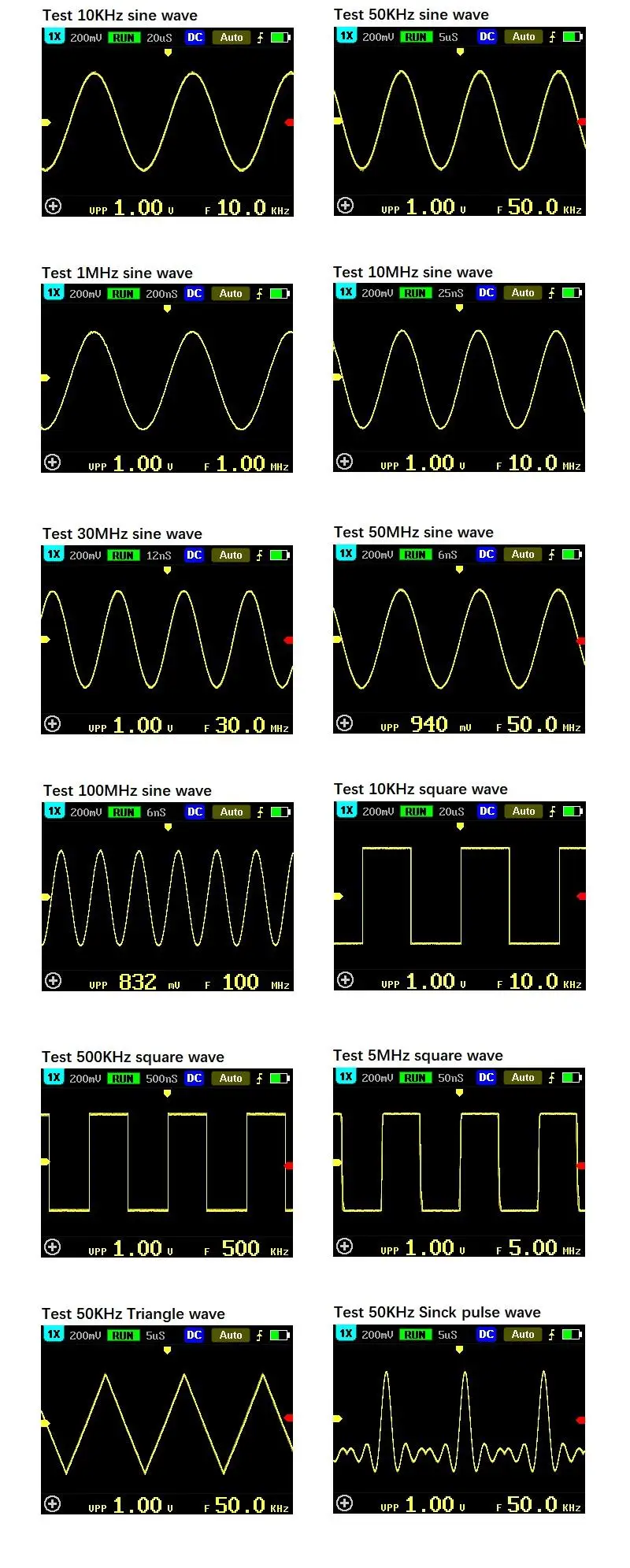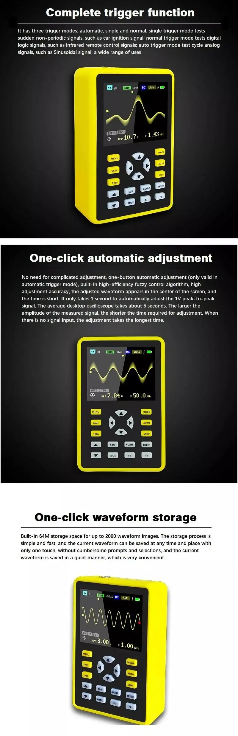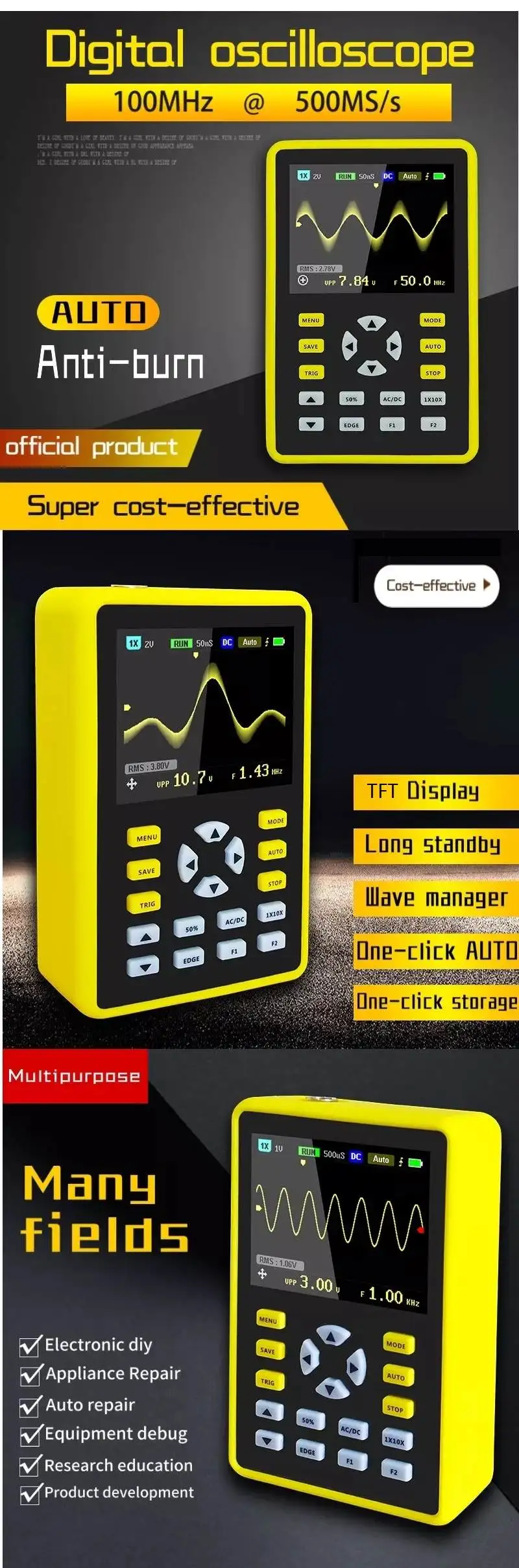 Характеристики: Ширина аналогового ремешка: 100 МГц Максимальная частота дискретизации в реальном времени: 500 мс/с Вертикальная чувствительность: 50 мВ/див ~ 100 в/Див Горизонтальный диапазон времени: 50S/div ~ 6NS/div Максимальное тестовое напряжение: 80 в (1X зонд), 800 в (10X зонд) Глубина хранения: 128 Кб Входное сопротивление: 1 м Точность ADC: 8 бит Режим соединения: AC/DC Режим запуска: одиночный, нормальный, автоматический Кромка триггера: восходящий/нисходящий край Внешнее триггерное напряжение 0 - 80 в Дисплей: 2,4 дюймов-320*240-на тонкопленочных транзисторах на тонкоплёночных транзисторах процесса Источник питания: литиевая батарея 3000 мАч Размер: 114 мм x 74 мм x 33 мм Вес: 500 г