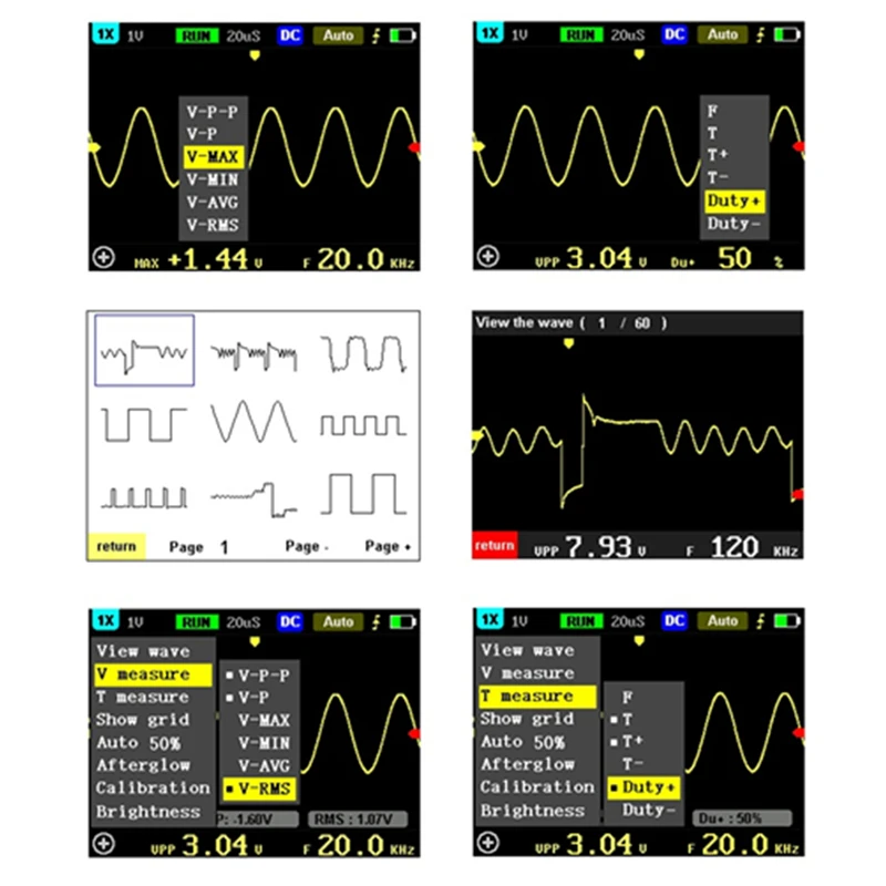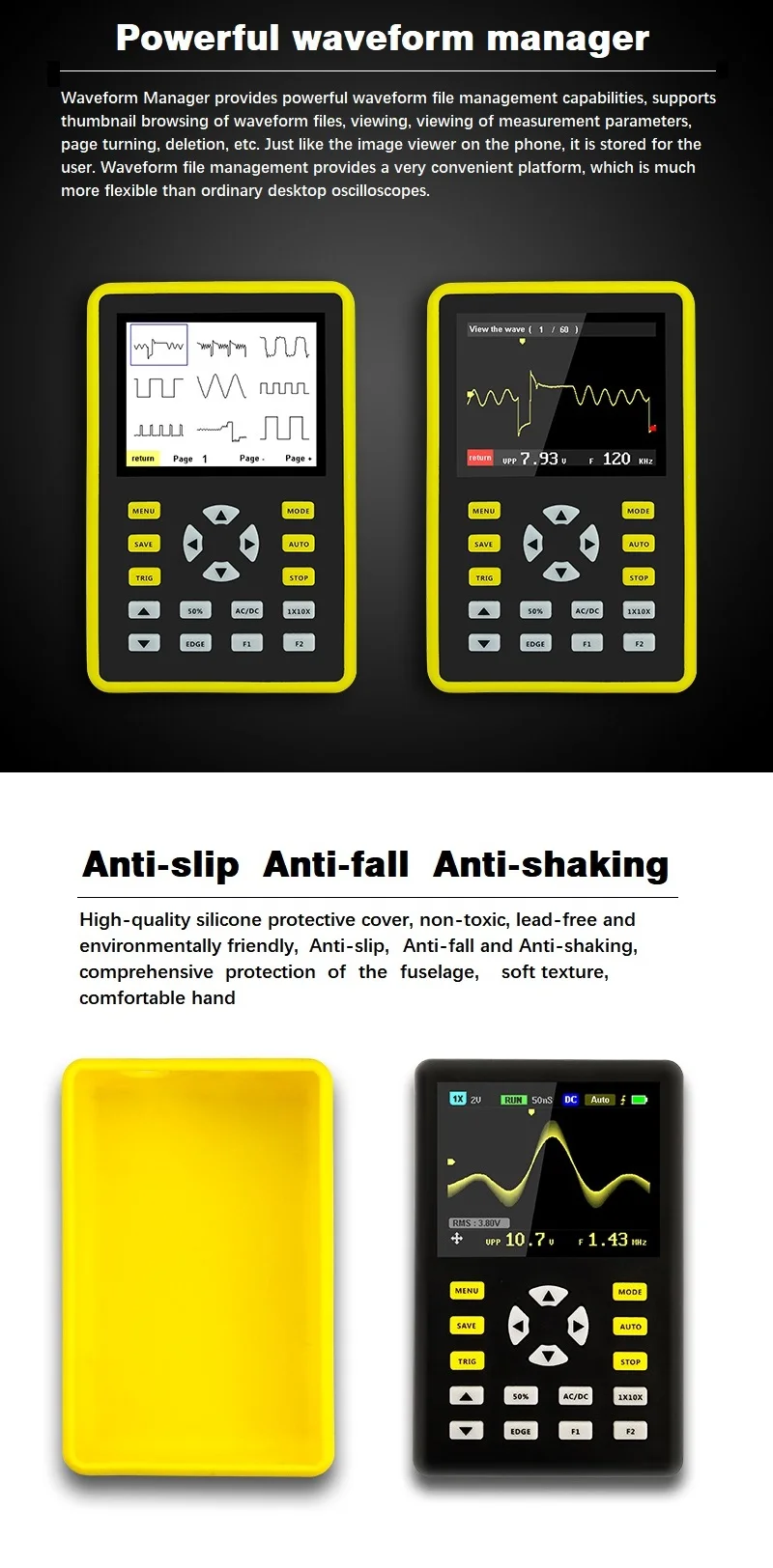 Особенности: 1: интеллектуальная защита от ожогов, 1X Выдерживает напряжение до 600 в 2: технология отображения после свечения 3:2.4 дюймовый экран цветной дисплей TFT 4: аналоговая полоса пропускания 100 МГц @ 500 мс/с частота дискретизации (1X = 5 МГц, 10X = 100 МГц) 5: хранение одной кнопки формы волны 6: встроенная память 64 м, Максимальная память 2000 изображений формы волны 7: мощный файловый менеджер сигналов, поддержка просмотра эскизов, просмотра, просмотра деталей, флип, удаления и других функций 8: Диапазон высокого измерения напряжения, 1X может измерять 0 ~ 80 в, 10X может измерять 0 ~ 800 в 9: до 12 параметров измерения: VPP,VP,Vmax,Vmin,Vavg,Vrms, частые, Duty +,Duty-,Time +,Time-,Time 10: в любое время дисплей формы волны (Функция паузы) заморожен 11: Оснащен высокой эффективностью одной кнопкой авто 12: Полная функция запуска (одиночный, нормальный, автоматический) 13: Встроенная перезаряжаемая литиевая батарея 3000 мАч, полностью заряжается в течение 8 часов непрерывного использования 14: Регулировка яркости экрана 15: технология сжатия памяти, экран обновления формы волны не мерцает 16: Противоскользящий силиконовый рукав 17: Ультра маленький объем, легко носить с собой
