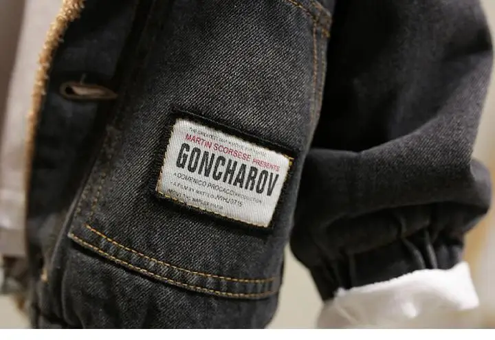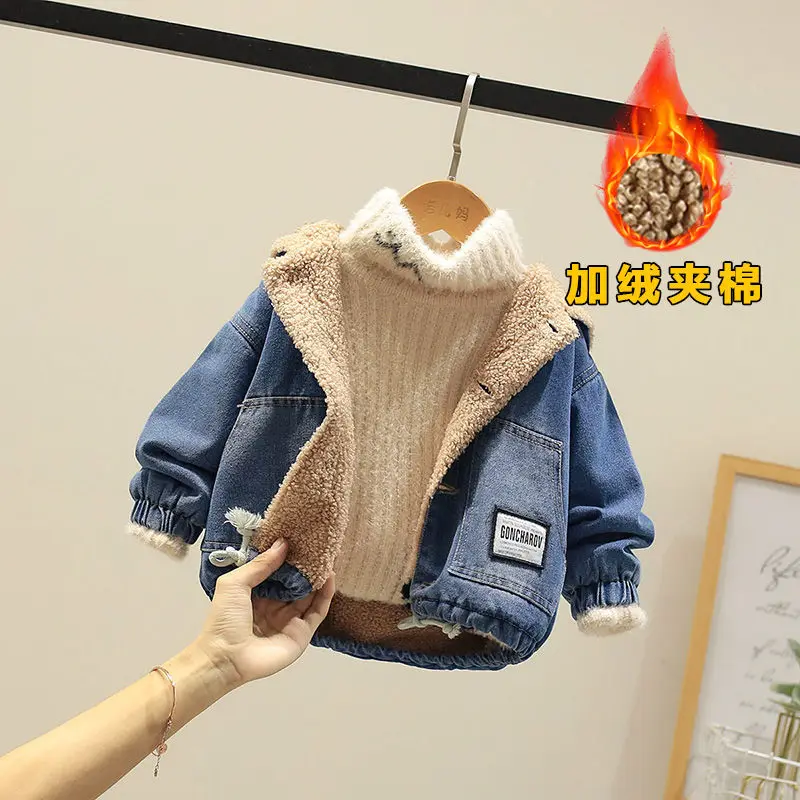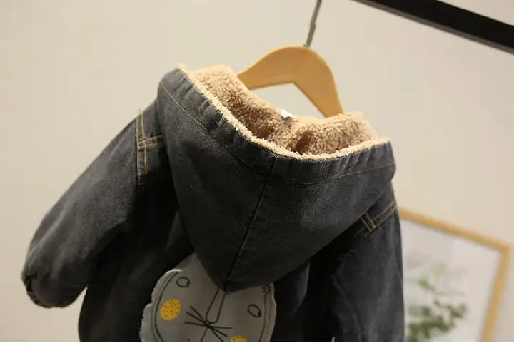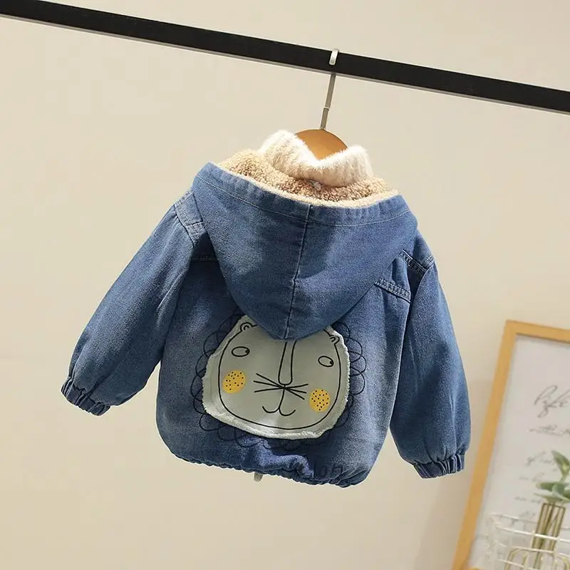 Лидер продаж, зимнее пальто для маленьких мальчиков Плотная джинсовая куртка зимнее пальто с капюшоном и рисунком для девочек подкладка из овечьей шерсти