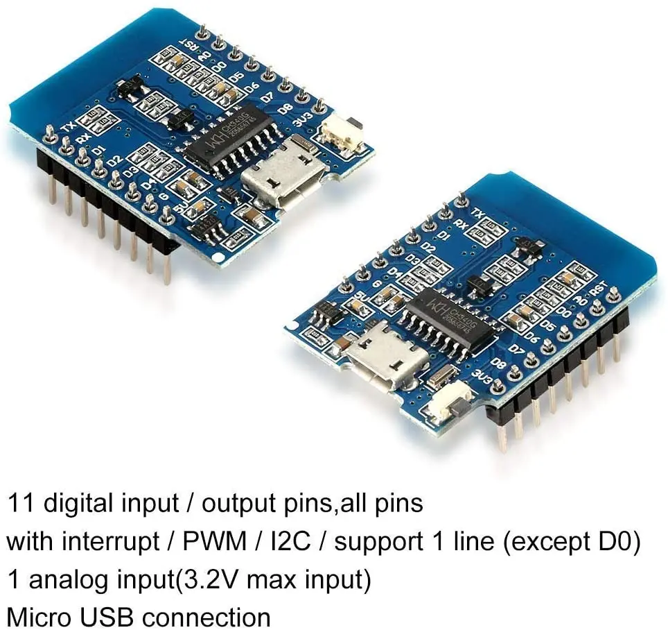 Данный модуль имеет меньший размер. Он более компактный и экономит место для вашего проекта. Эта плата содержит 11 цифровых входных/выходных контактов, все контакты имеют прерывание/pwm / I2C/1-провод и micro USB-соединение. Данная плата на 100% совместима с Arduino и WeMos и может быть запрограммирована в Arduino IDE. Макетная плата WIFI, 4 Мб флэш-памяти.