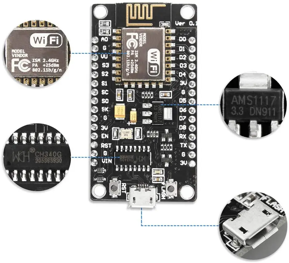 ESP8266 CH340 NodeMCU LUA плата для разработки Интернета, модуль последовательного порта Wi-Fi, последовательный беспроводной модуль 4M Flash для Arduino[Порядок использования] загрузка данных на веб-сайт: http://www.nodemcu.com/index_en.html ссылка на прошивку: https://github.com/nodemcu/nodemcu-прошивка 【 Мощный модуль Wi-Fi для ESP8266 】 NodeMcu v3, Модернизированный до чипа CH340; Обеспечивает быстрое развитие благодаря прошивке NodeMcu; Это устройство для Интернета вещей со всеми доступными ресурсами на борту, поддержка интеллектуальной связи и умных сетей. 【 32-битный процессор Tensilica 】микроконтроллер интегрирует 32-битный процессор Tensilica L106 RISC, который обеспечивает сверхнизкое энергопотребление и достигает максимальной тактовой скорости 160 МГц. Операционная система в реальном времени (RTOS) и стек Wi-Fi позволяют использовать около 80% вычислительной мощности для программирования и разработки пользовательских приложений. 【 Энергосберегающая архитектура 】разработана для мобильных устройств, носимой электроники и приложений IoT, 8266EX обеспечивает низкое энергопотребление благодаря сочетанию нескольких запатентованных технологий. Энергосберегающая архитектура отличается тремя режимами работы: активный режим, спящий режим и режим глубокого сна. Это позволяет конструкции на батарейках работать дольше