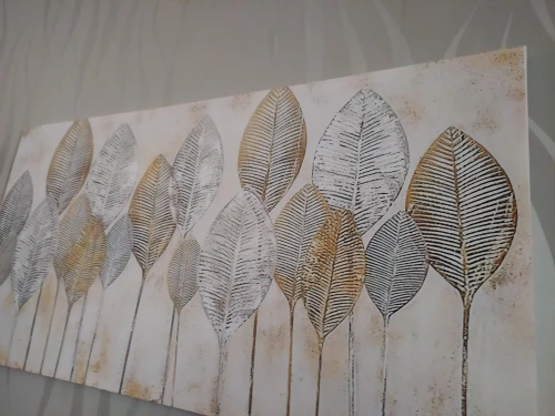 По факту картина гораздо светлее, выглядит довольно примитивно (как будто распечатали на черно-белом принтере). На фото в описании преобладают золотые и серебристые краски, по факту это просто черно-белая печать на белом фоне с бежевыми пятнами