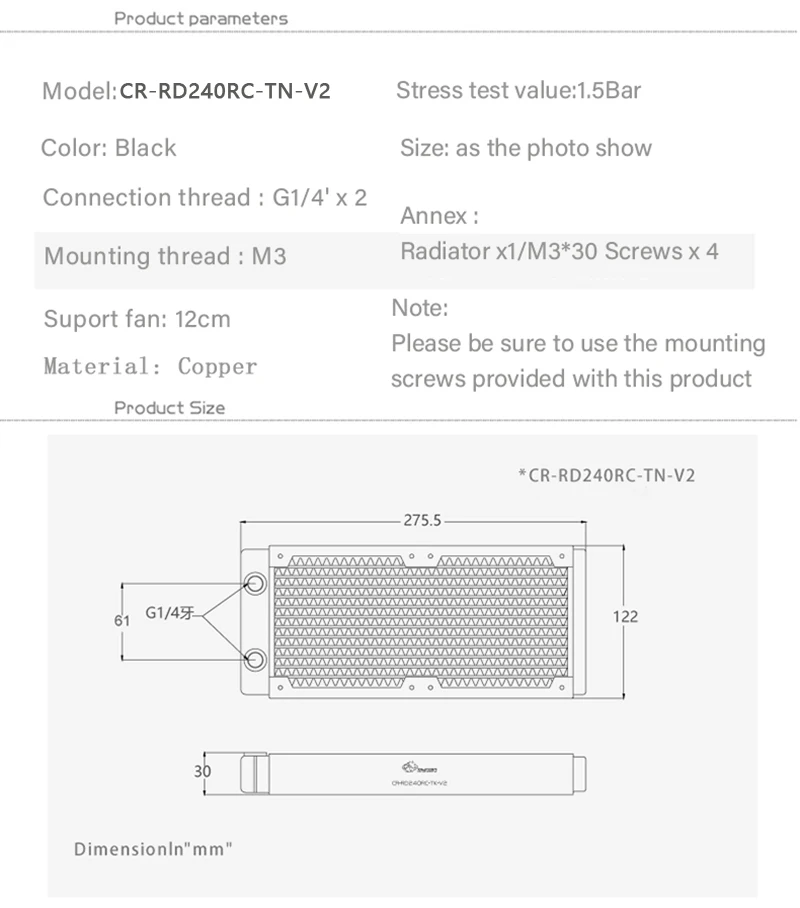 Медный радиатор BYKSKI 240 мм для охлаждения ПК, толщина 30 мм для 12 см, вентилятор, Водяной кулер, высокая производительность, 120 мм, вентилятор CR-RD240RC-TN-V2