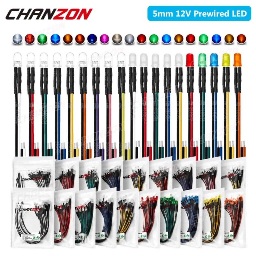 Набор диодов головного света, 5 мм, 12 В, теплый белый, красный, зеленый, синий, желтый, оранжевый, УФ, розовый