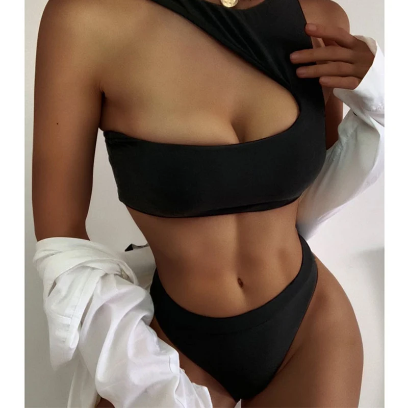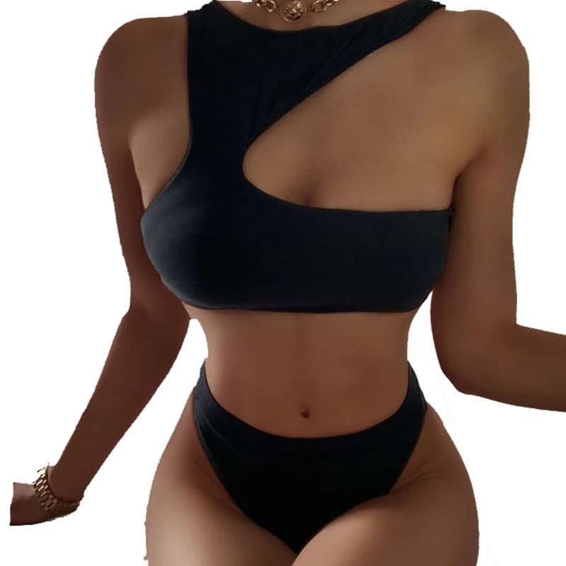Черный бикини 2020, женский купальник-бандо, женский купальник неправильной формы с высоким воротом, Женский однотонный костюм из 2 предметов, сексуальный купальный костюм бикини