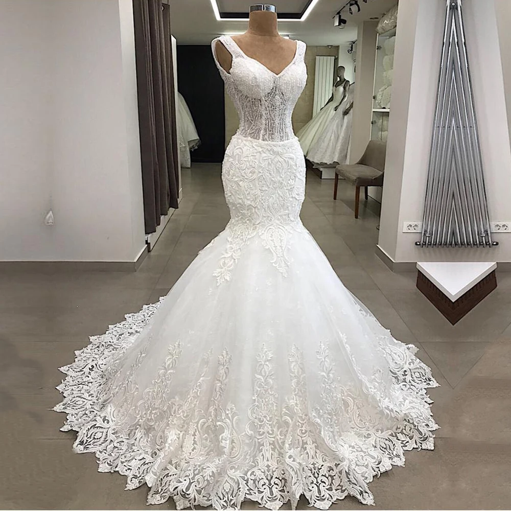 Женское свадебное платье, с V-образным вырезом и длинным шлейфом, украшенное кристаллами, размера плюс