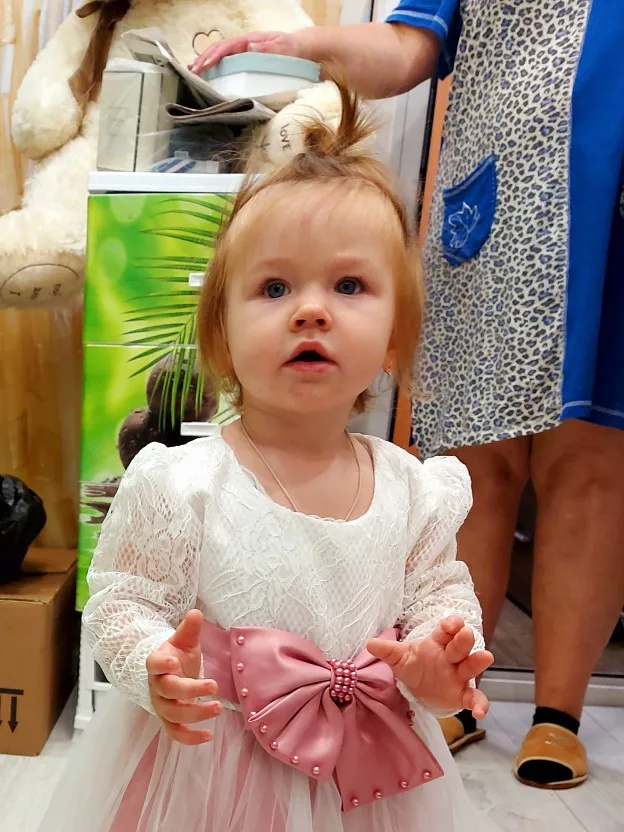 заказала размер 9М(80 рр) на рост ребёнка 80 см,чуть большое,полноты не хватает. Платье красивое, пышное,присутствуют нитки,бант на спине отстегивается.Украшение для головы тугое-не использовали. Стирать в холодной воде,сильно линяет. Заказывала через plus доставка очень быстрая до Хабаровска за 17 дней.