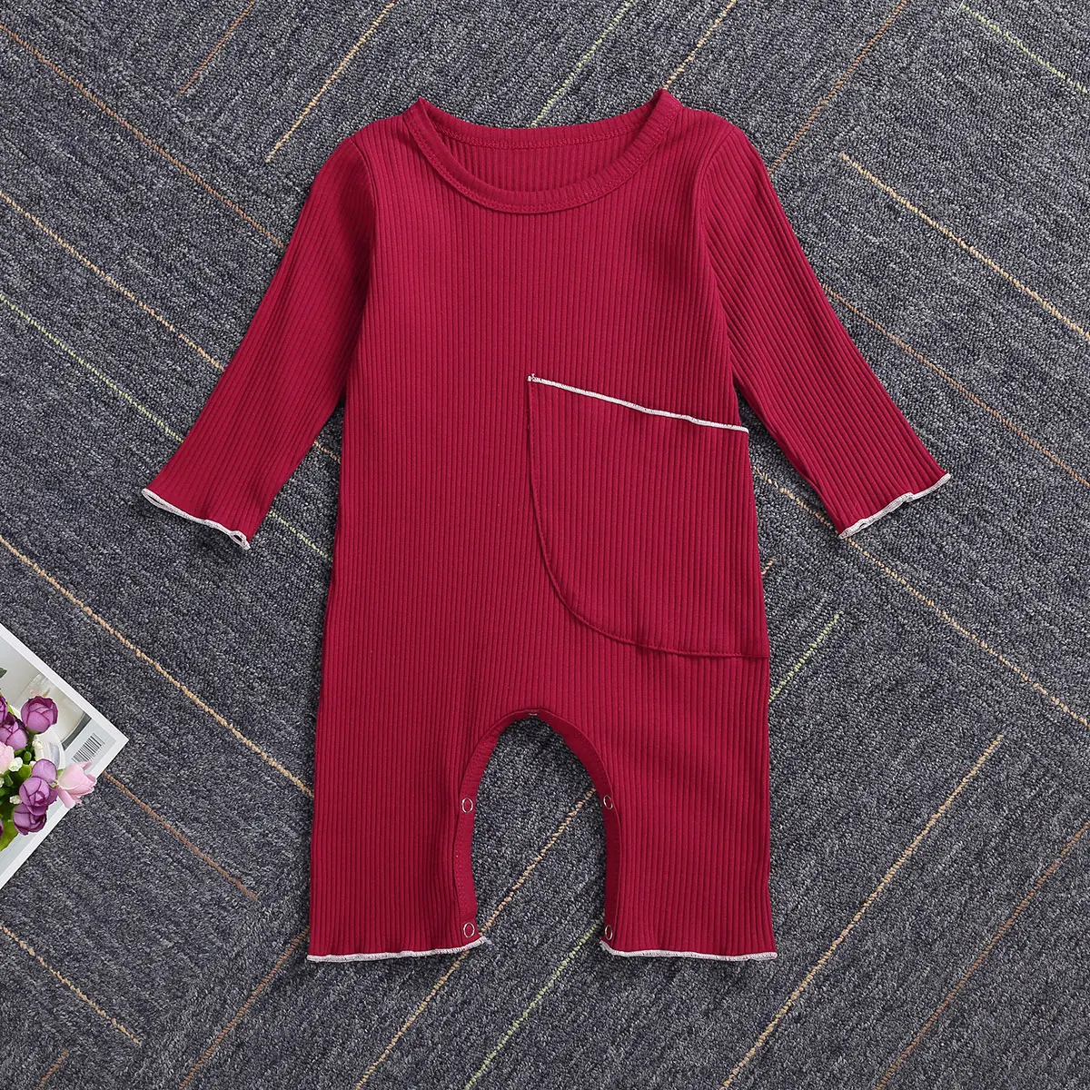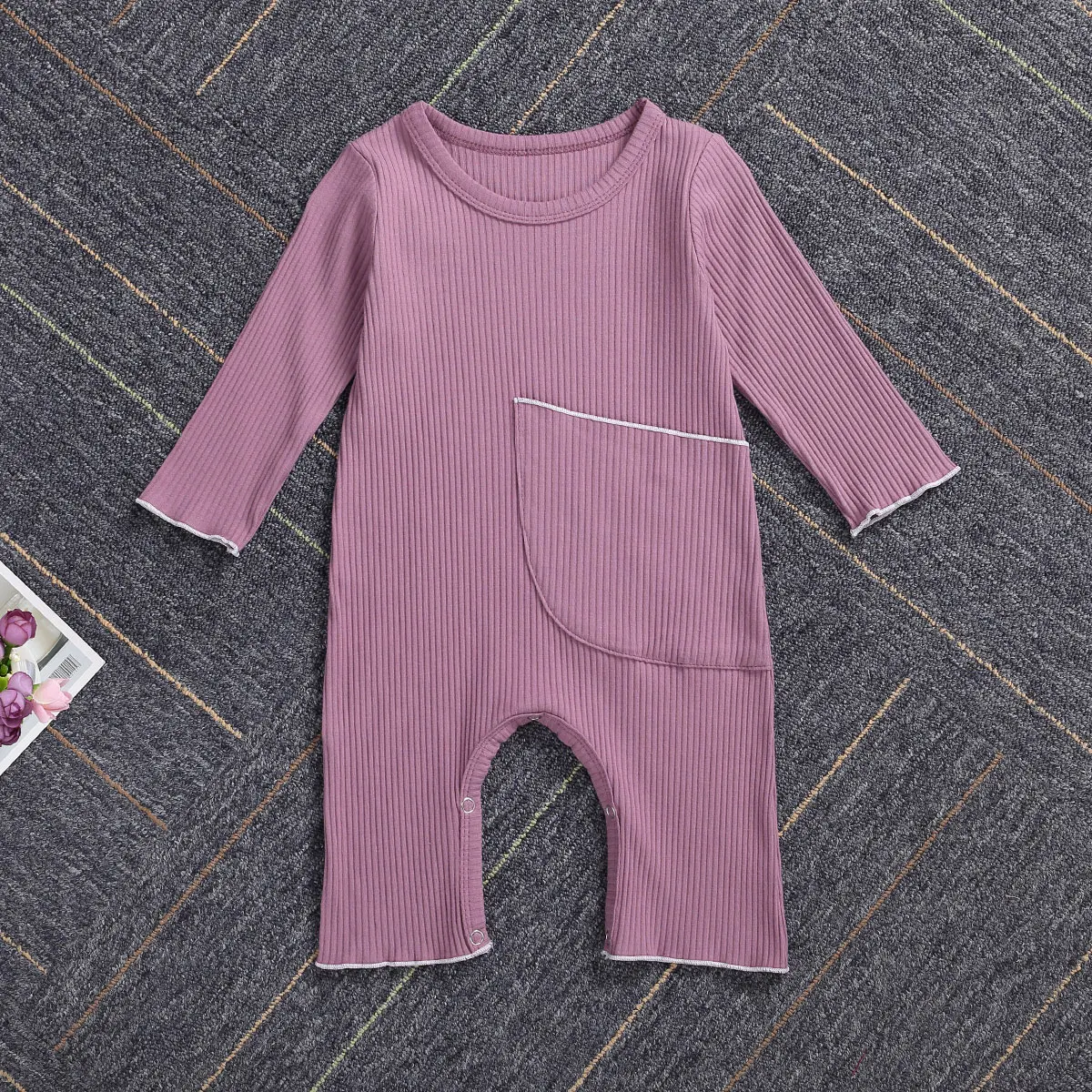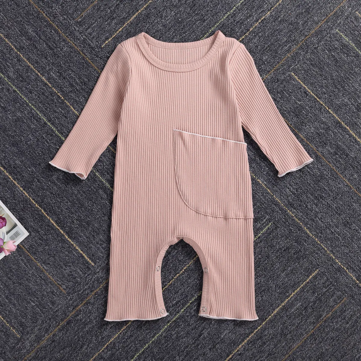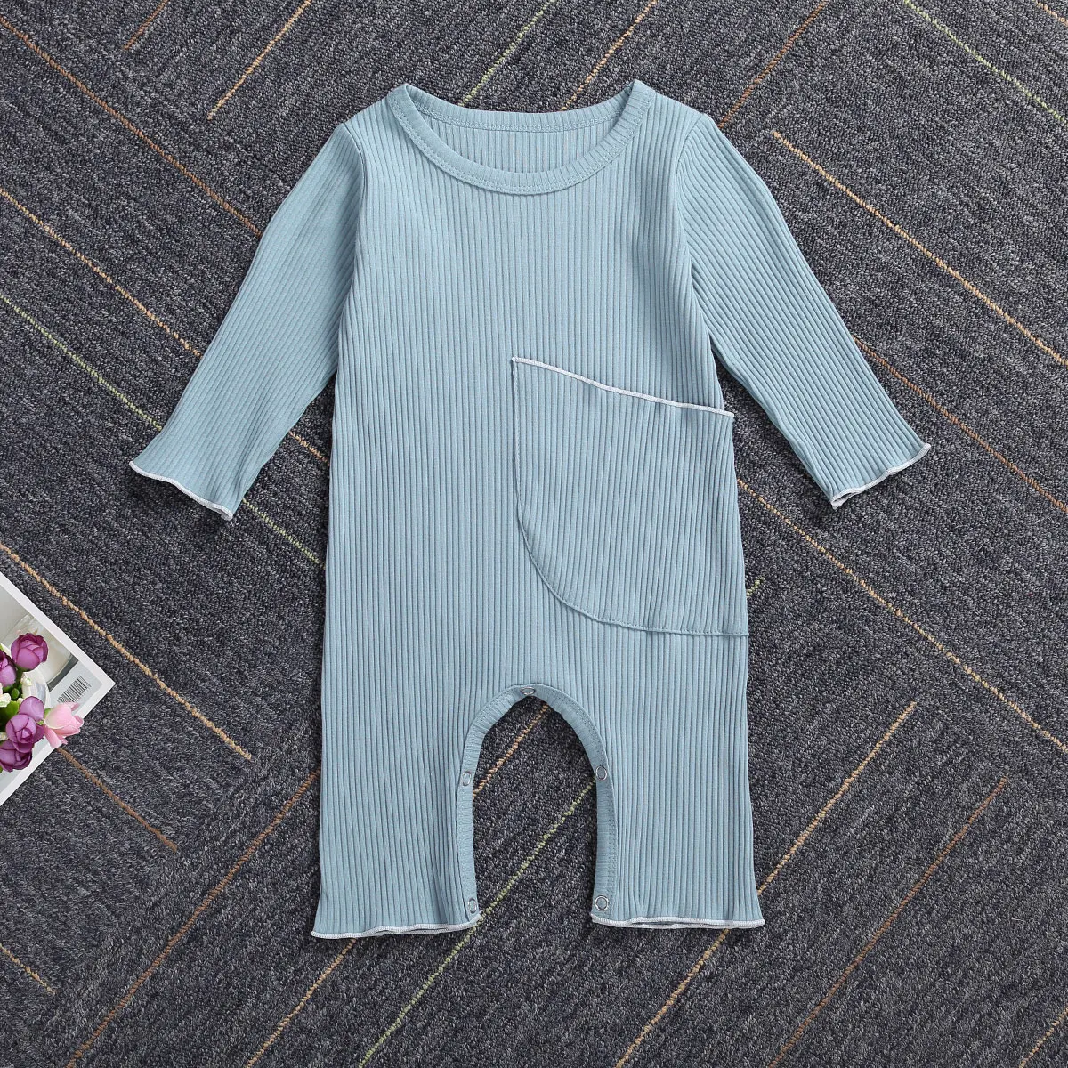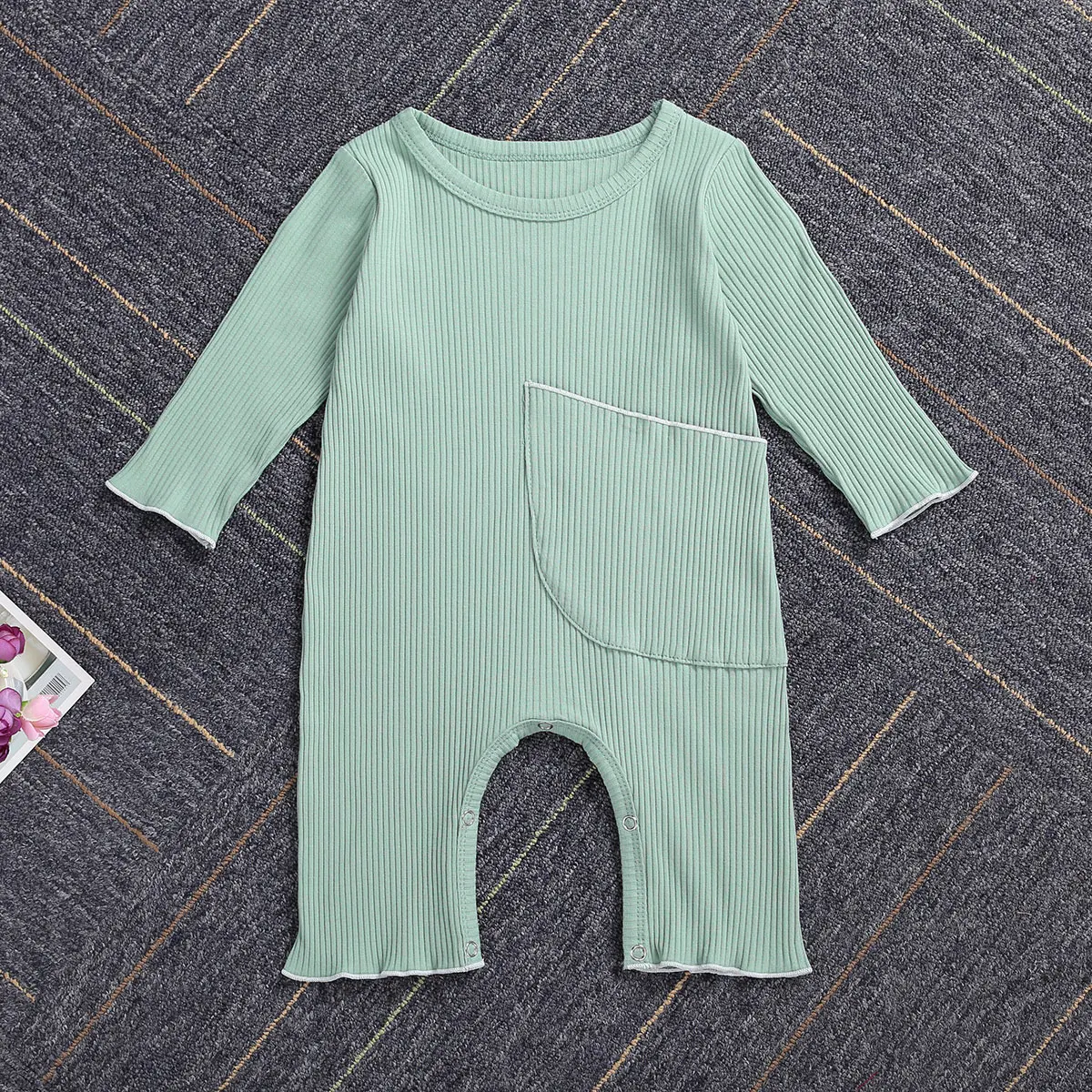 Комбинезон в рубчик для новорожденных девочек и мальчиков, однотонный трикотажный комбинезон с длинным рукавом и большими карманами, на весну и осень, цельнокроеный
