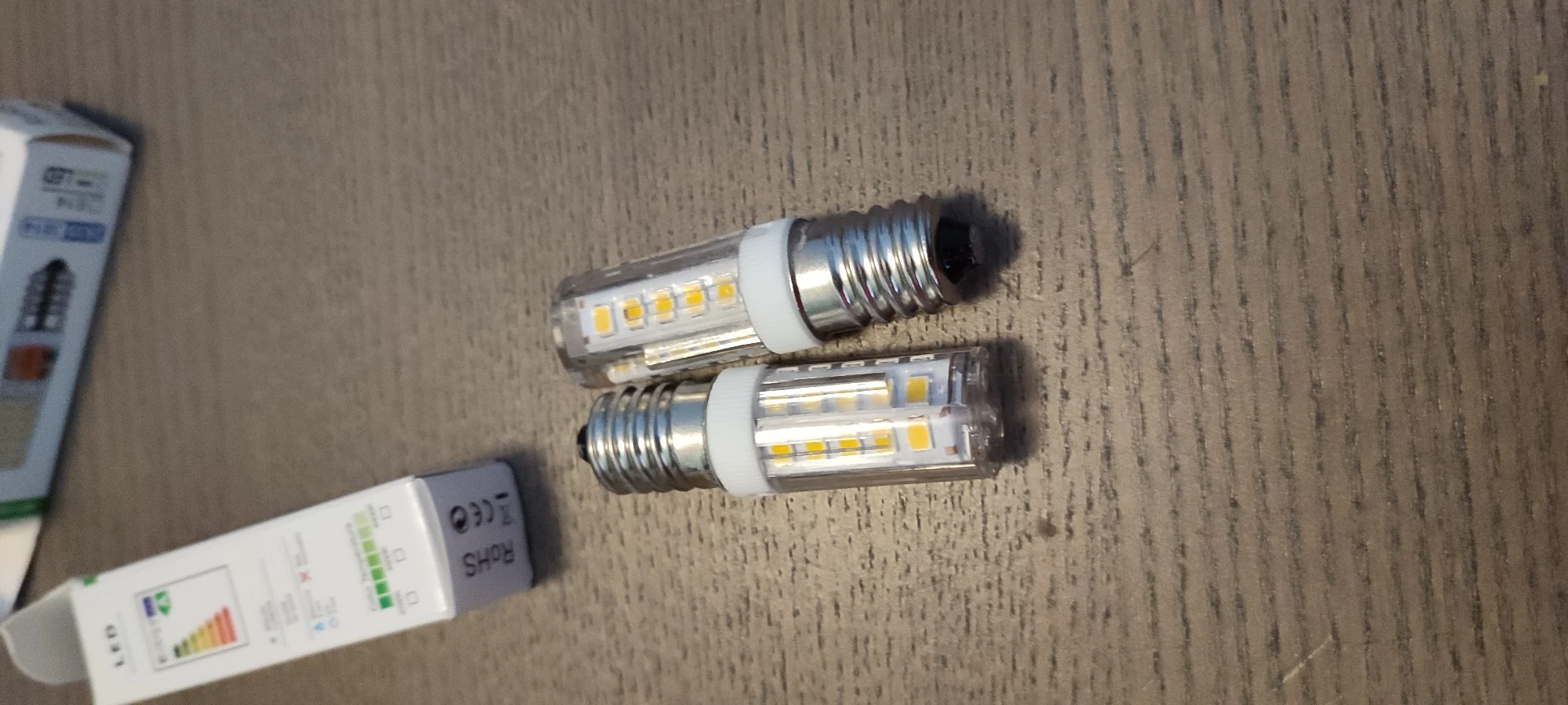 Пришли в корочках и мягкой упаковке. Для холодильника подошли. Но думал, что будут больше по размеру. Светят хорошо. Сколько прослужат, время покажет!