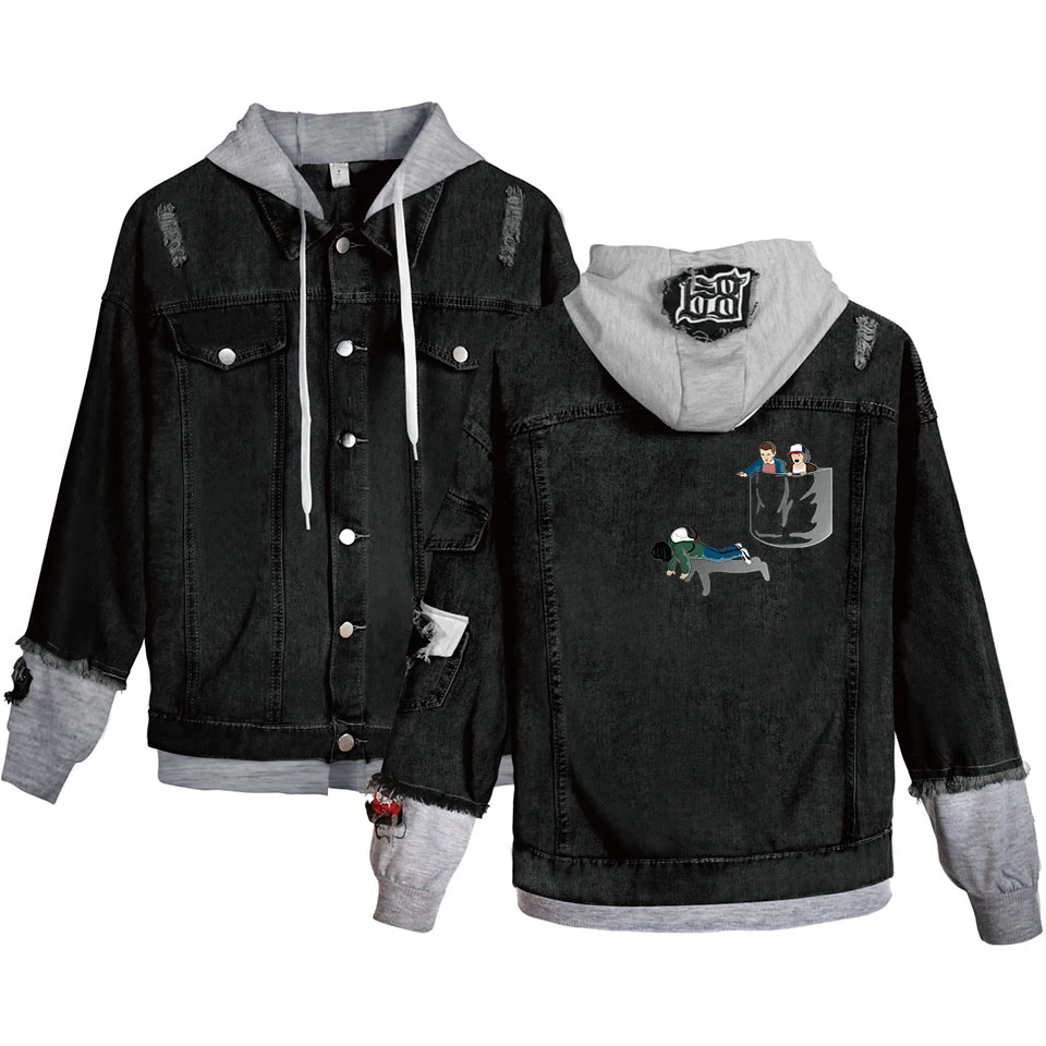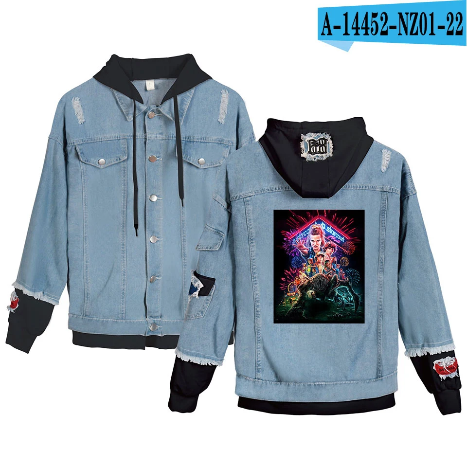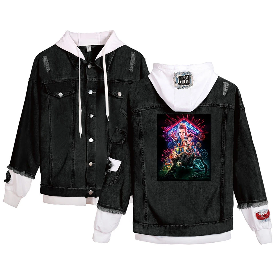Модная Джинсовая куртка в стиле Харадзюку с имитацией двух толстовок и надписью очень странные дела, куртки для мужчин и женщин, Студенческая Толстовка для отдыха