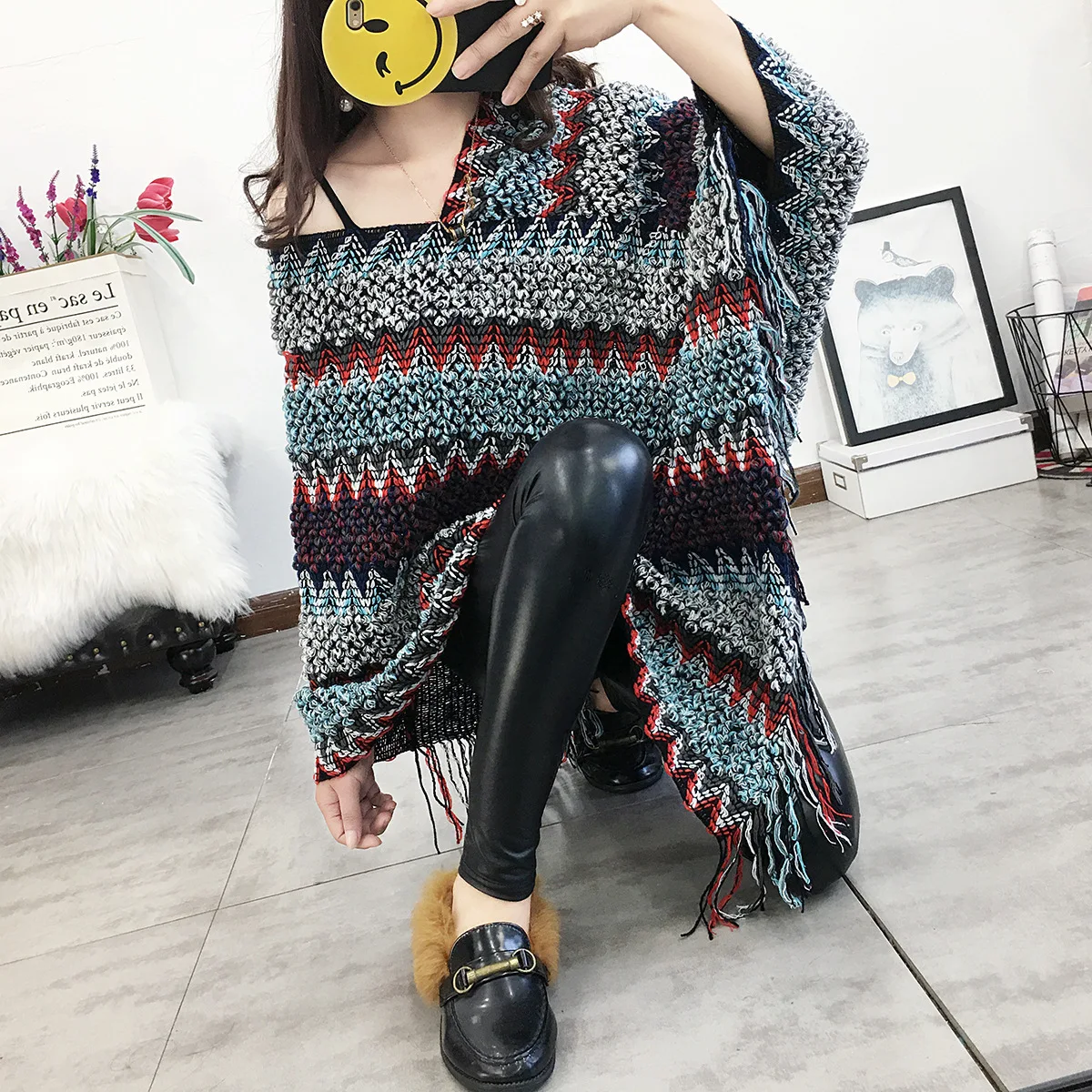 Женский геометрический плащ, шаль с кисточками, вязаный весенний удлиненный мохеровый шарф с бахромой, длинная шаль, повседневное пончо