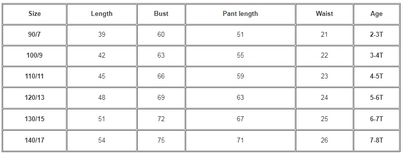 Размер Длина Бюст Длина брюк Талия Возраст 90/7 39 60 51 21 От 2 до 3 лет 100/9 42 63 55 22 От 3 до 4 лет 110/11 45 66 59 23 От 4 до 5 лет 120/13 48 69 63 24 От 5 до 6 лет 130/15 51 72 67 25 От 6 до 7 лет 140/17 54 75 71 26 От 7 до 8 лет