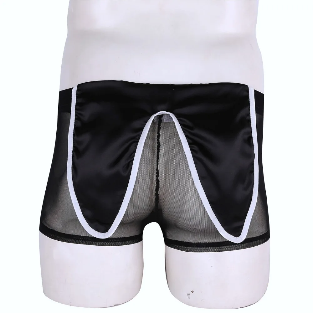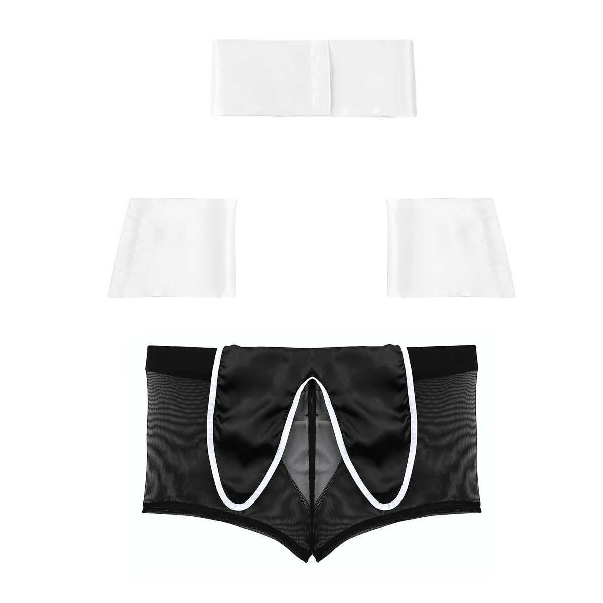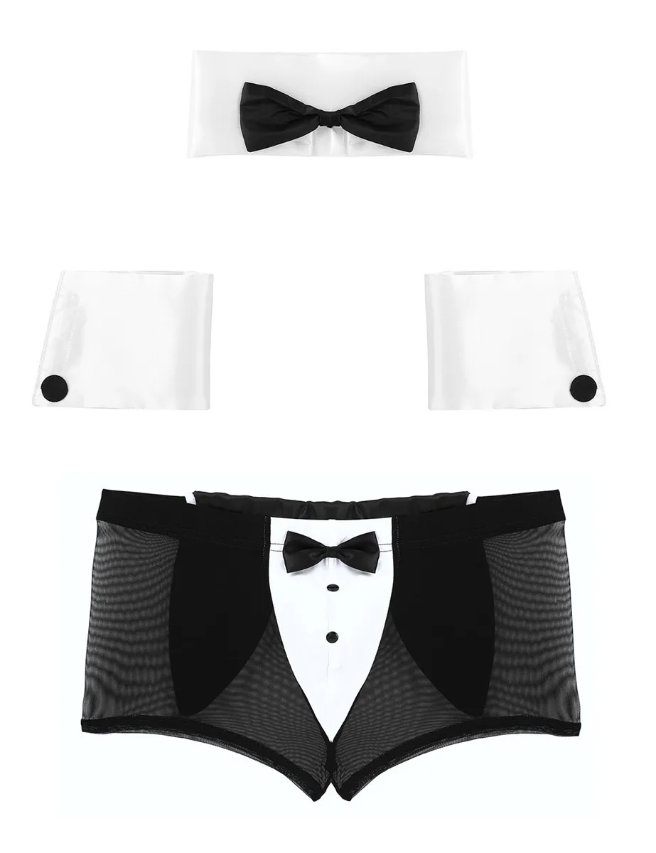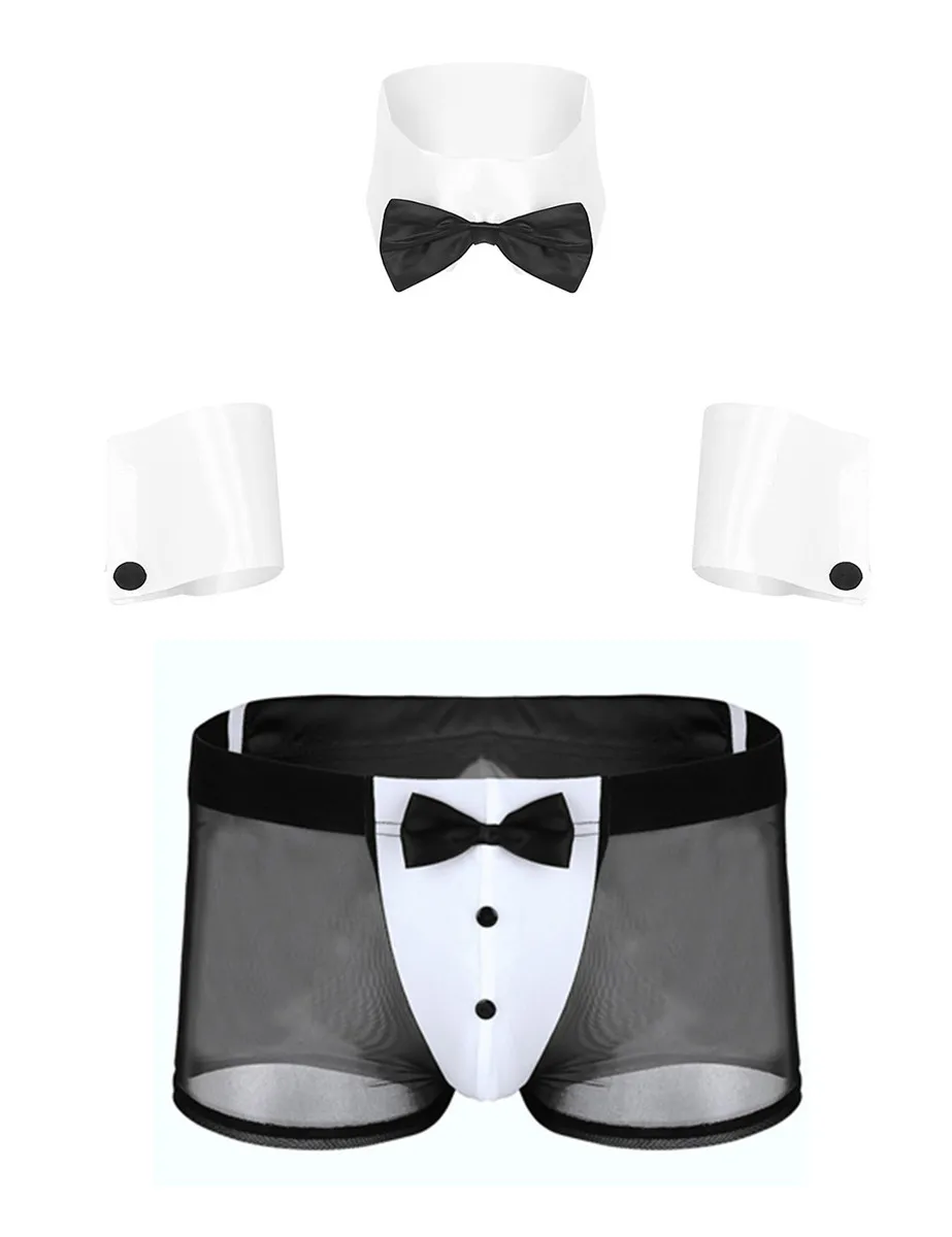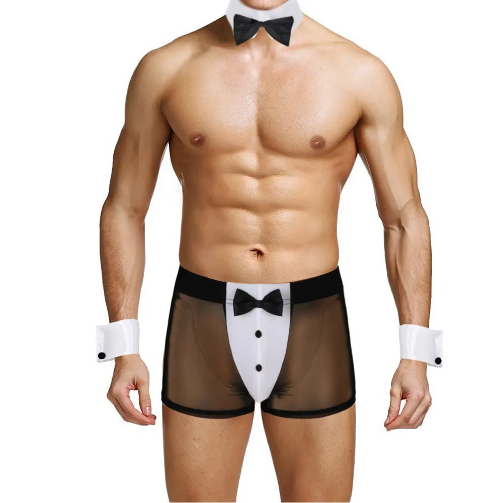 Мужской комплект нижнего белья, костюм для взрослых, аксессуары, воротник-бант, манжеты, сетчатые трусы-боксеры, шорты, нижнее белье с заячьими ушками
