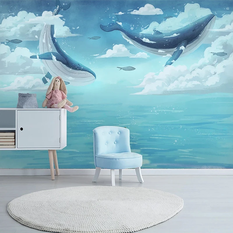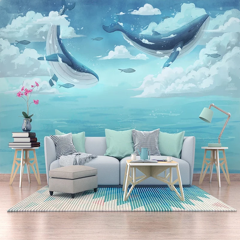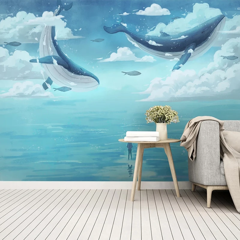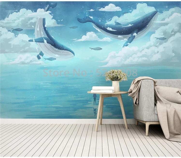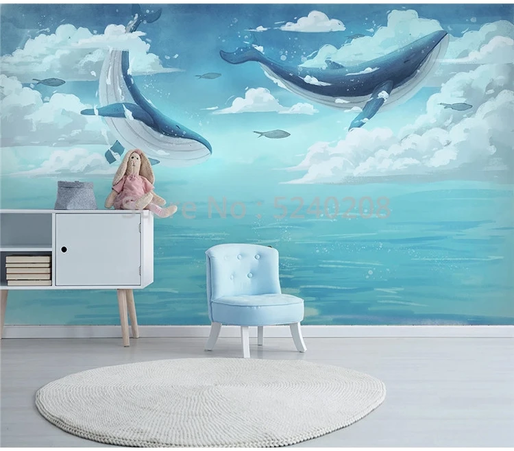 Пользовательские самоклеющиеся обои современный креативный 3D акварельный океан КИТ детская комната росписи мультфильм синий фон наклейки