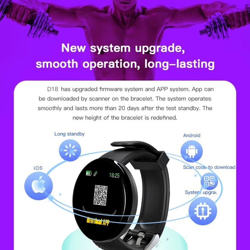 D18 Смарт-часы фитнес-трекер крови Давление сердечного ритма, Смарт-часы спортивные часы для мужчин женщин Водонепроницаемый для IOS и Android