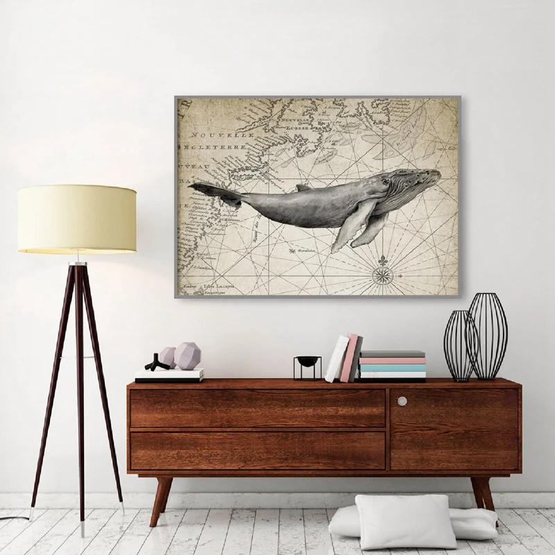 Винтаж тон горбатый живопись c изображением Кита на карте распечата...