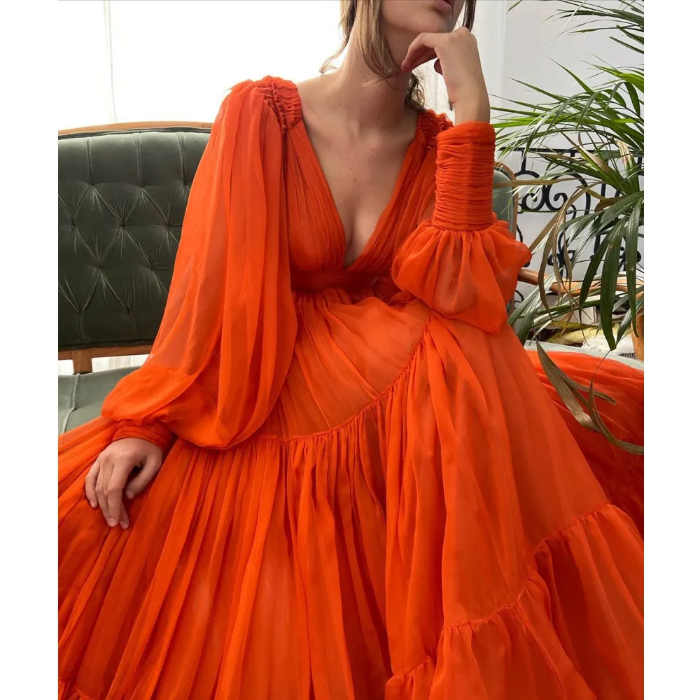 Женское шифоновое вечернее платье HONGFUYU, оранжевое вечернее платье-трапеция с глубоким V-образным вырезом, длинное вечернее платье для выпускного вечера