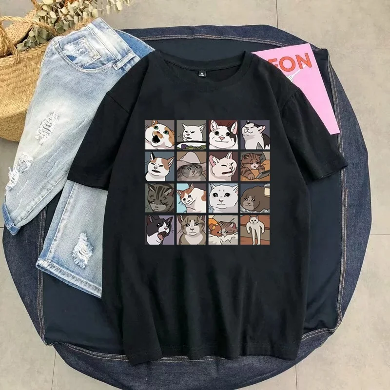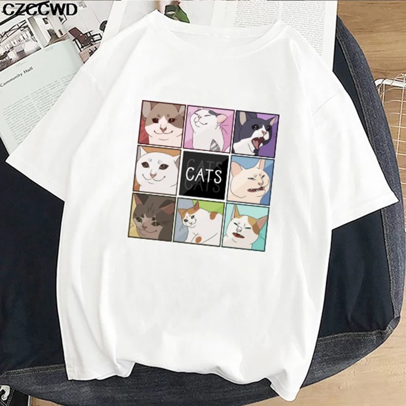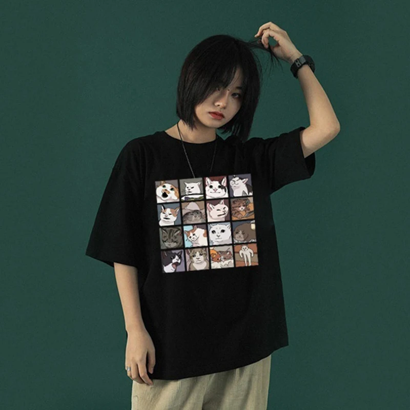 Летняя футболка Ulzzang с мультяшным хиппи смайликом кавайным котом Женская Футболка Harajuku, винтажная Свободная Женская футболка с коротким рукавом, одежда