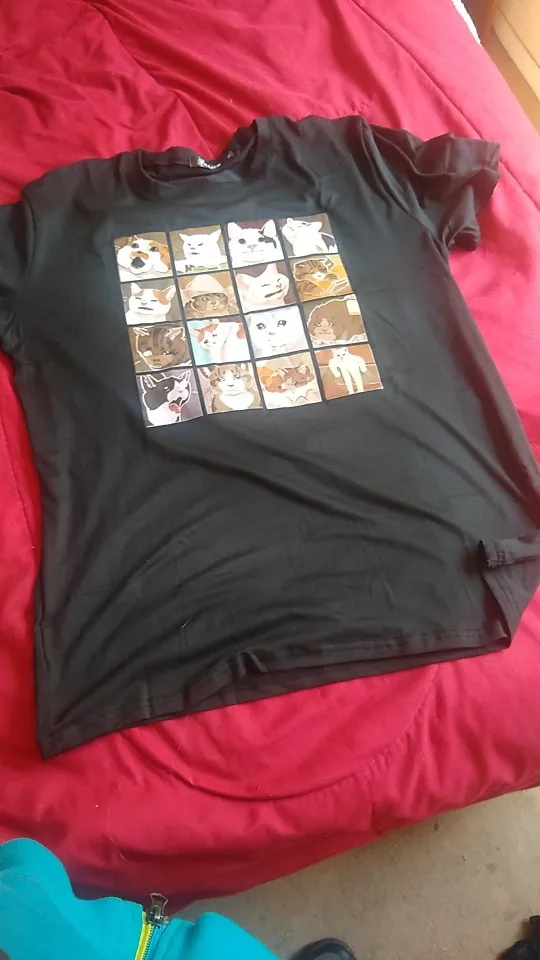 Рубашка не из хлопка, как я ожидала, но это моя вина за то, что я не проверила, но это не ужасно. Однако изображения в порядке по большей части, за исключением того, что некоторые глаза размыты или полностью выбелены по какой-то причине? Как будто принтер не распознает глаза или что-то еще. Все еще не слишком плохо, я все еще буду носить его