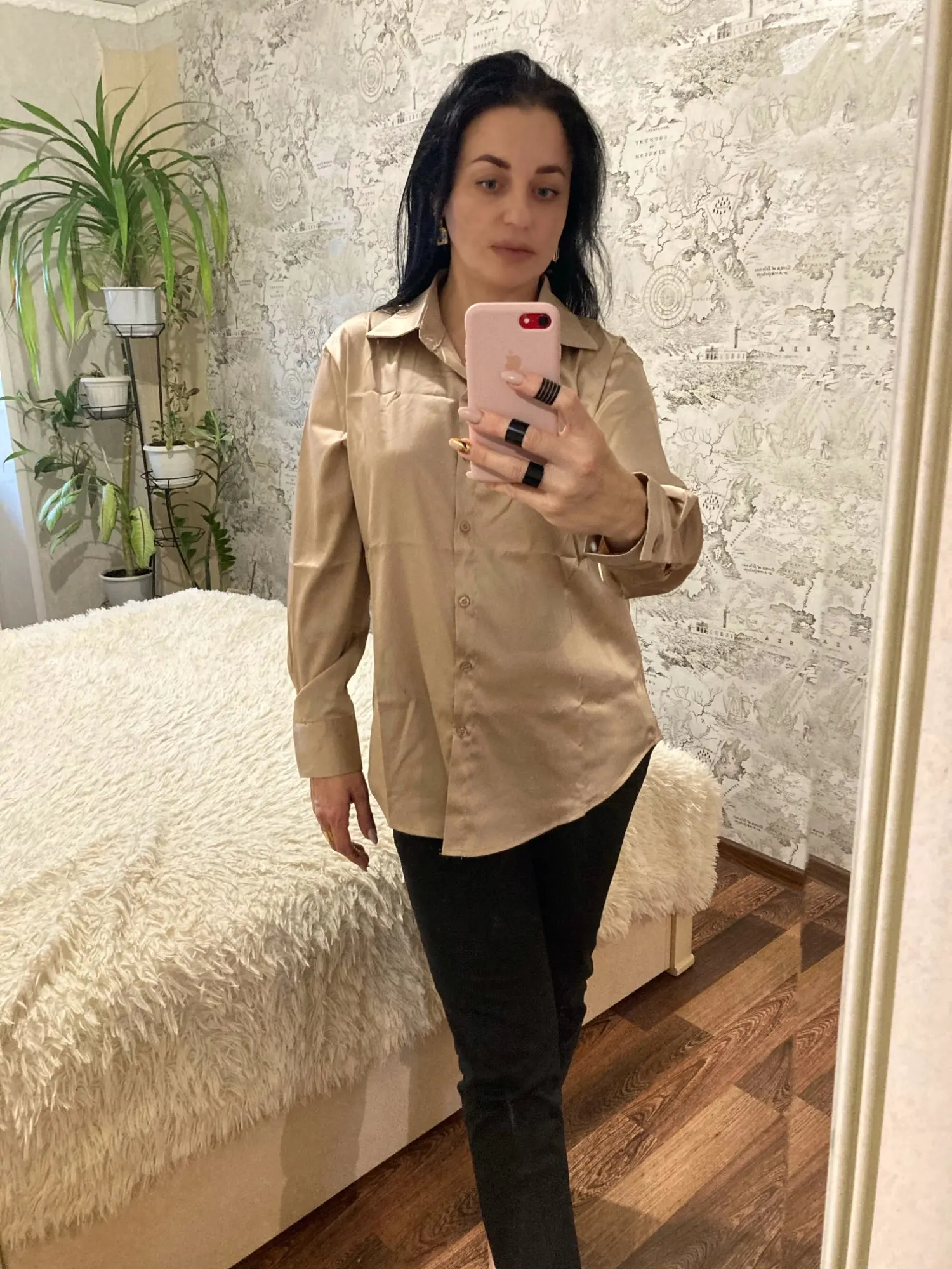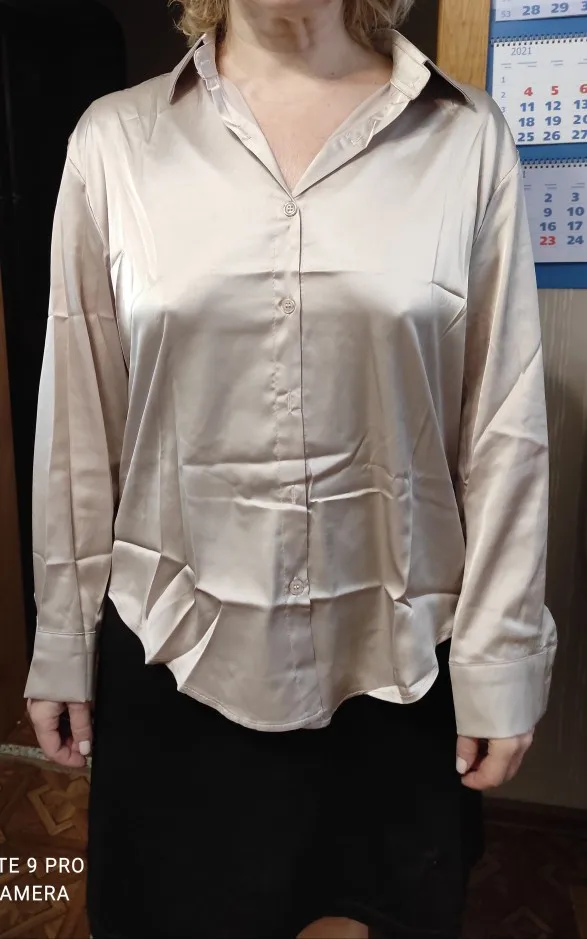 Рубашка очень классная. Купила темно синего цвета. Шёл очень долго. Обещали к концу декабря, купила для праздников но пришёл товар 8го . Размер с для 44 размера как раз, но не оверсайз, ни где не тянет. Материал приятный на ощупь, но тонкий очень. Думаю не долго будет служить. Пальцев через материал видать на просвет. С продавцом не общалась.