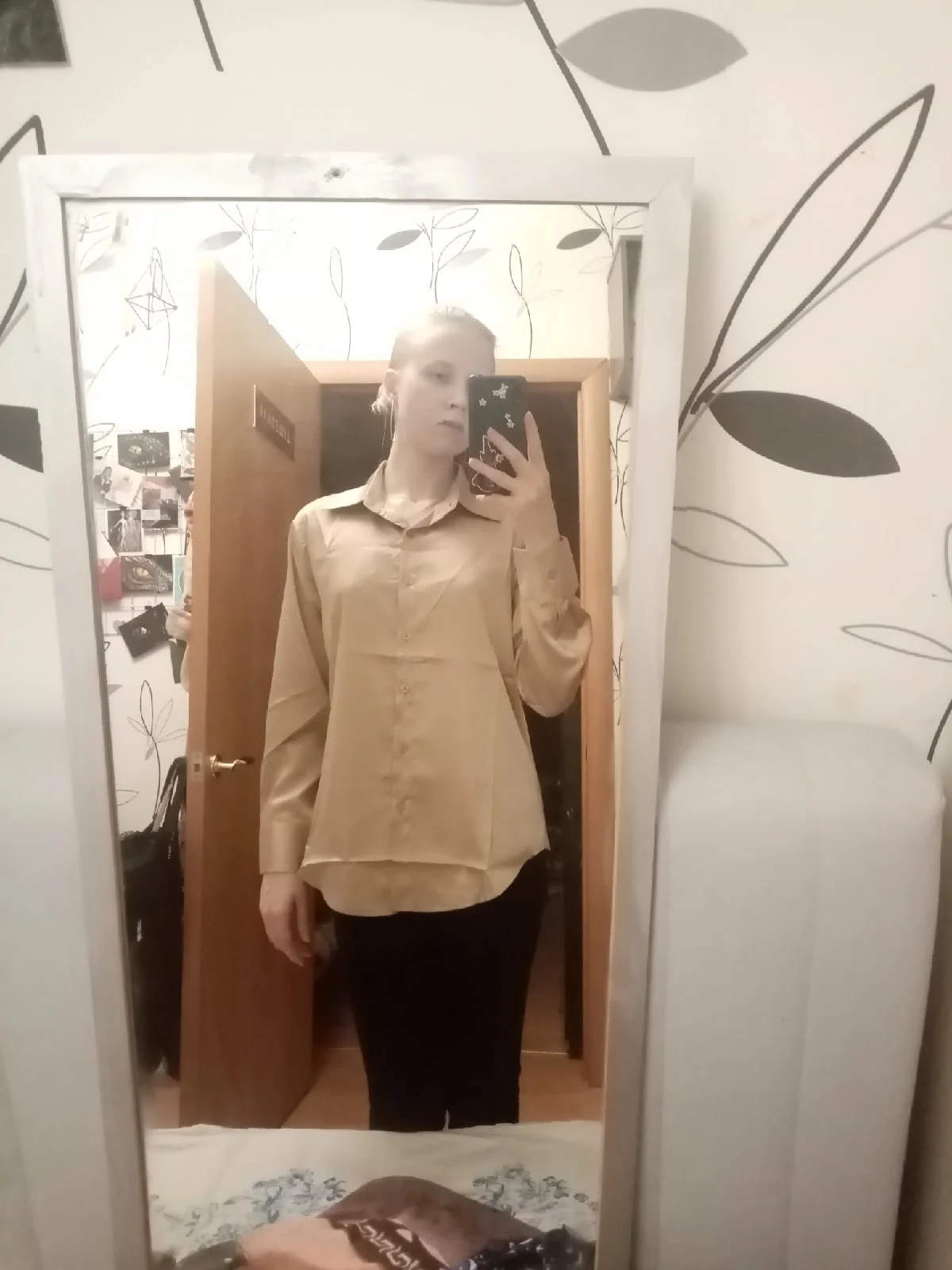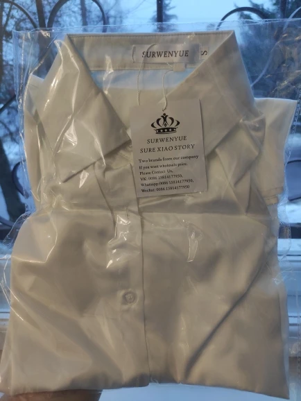 Купила для того, чтобы ходить на учёбу. Товар приехал быстро, был упакован в обычный покетик. Т.к. не нашла размерной сетки, взяла размер S. Сидит свободно. Мои параметры для наглядности: бюст-77 см, талия-63 см, рост- 163 см, вес-47 кг. Материал приятный на ощупь, не колется и не вызывает раздражение на коже, слегка просвечивает. Пуговицы пришиты хорошо, не болтаются. Кое-где есть ниточки, но это не критично. Сама рубашка выглядит красиво. Не могу сказать как ведёт себя в носке т.к. никуда не надевала её по понятным причинам. Рубашка классная. Рекомендую к покупке.