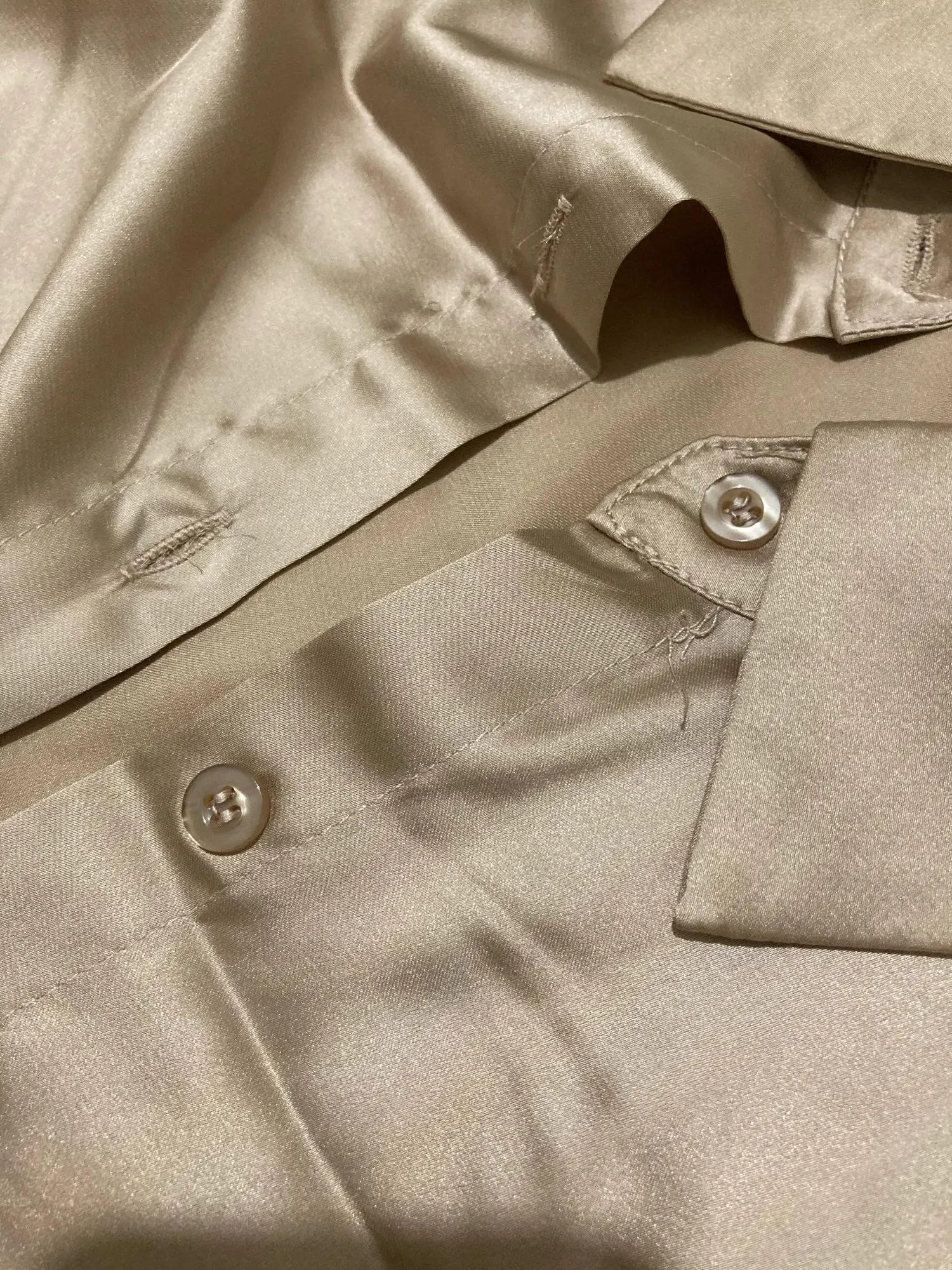 Fast shipping, the silk is of a great quality - very soft and shiny, looks really fancy! Ordered the size L, which would be my usual size for shirts, and it fits perfectly :)! And the apricot colour is very pretty!
