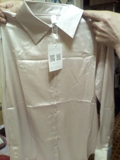 рубашка классная.к телу приятная.атлас шелк.только с размером прогадала на меня 44-46 L сидело бы хорошо.а так получилось ну слишком свободная.буду ушивать или носить поверх боди например.нитки не торчат.до СПб 2 недели