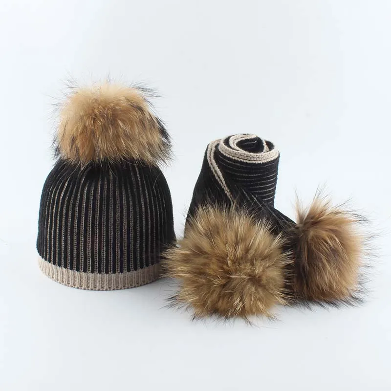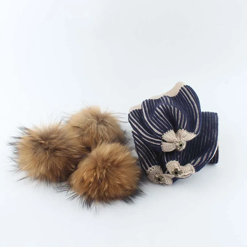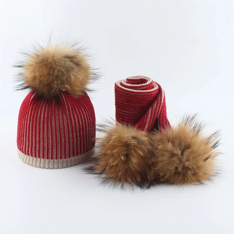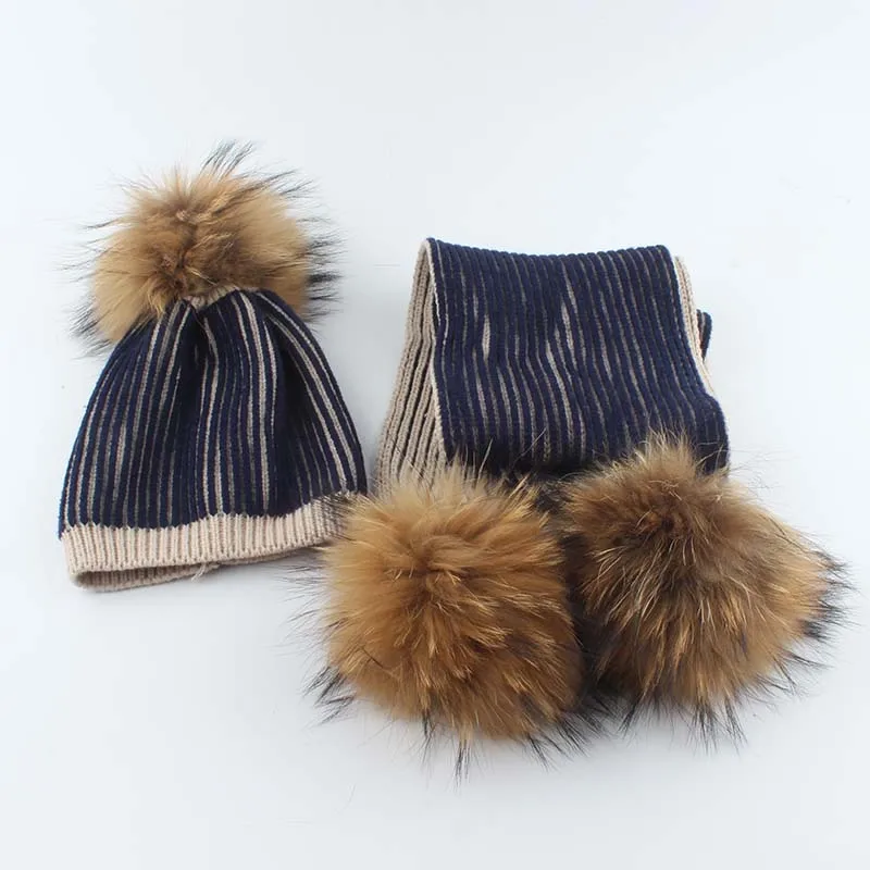 Детские шарфы с помпонами из натурального меха, комплект, костюм Khildren, вязаная шапочка, шапки для маленьких мальчиков и девочек, шапки, шарф, зимняя теплая шапка 2020