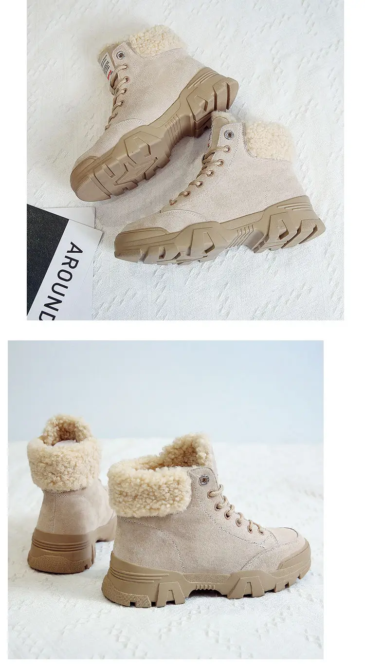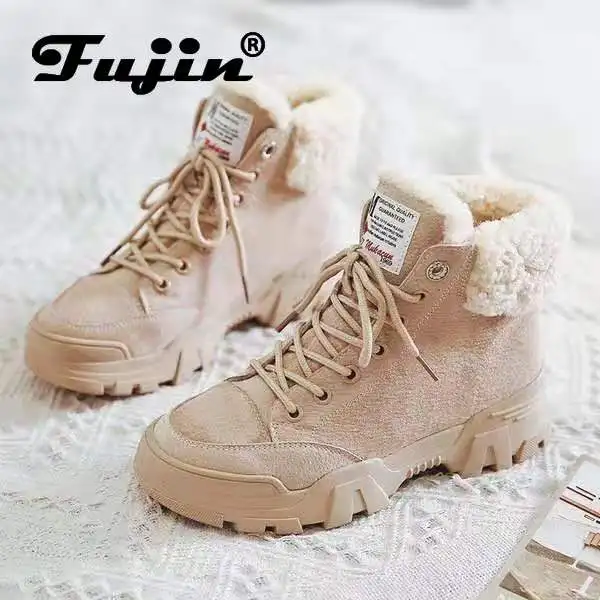 Ботинки женские зимние fujin, бежевые, плюшевые, на толстой подошве, со шнуровкой