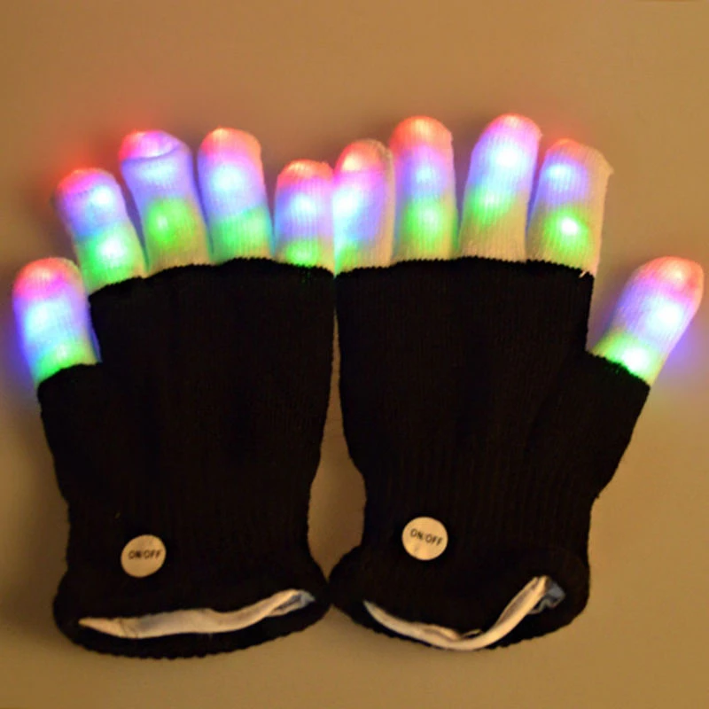 Детали Цвета светодиодов: красный, синий, зеленый на каждом пальце Один размер подходит для большинства. Режимы мигания: 1. Все огни гладятся. 2. Все огни постоянно горят. 3. Плавление от красного до зеленого до синего. 4. Красный стробоскоп. 5. Синий стробоскоп. 6. Зеленый стробоскоп. 7. ВЫКЛ. Спецификация: Материал: 100% нейлоновая перчатка + cob + led 3. Цвет корпуса: черный Переключатель: кнопка включения/выключения