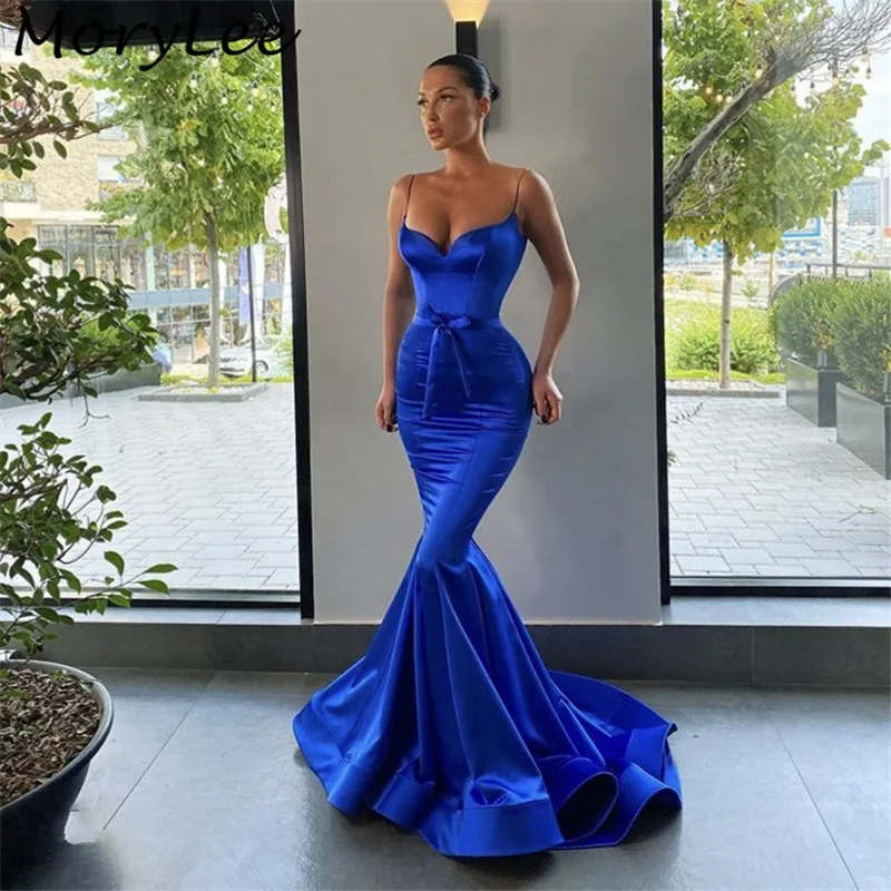 Платье женское атласное на тонких бретельках, длинное шелковое платье синего цвета с бантом, с юбкой годе, на молнии сзади, для выпускного вечера