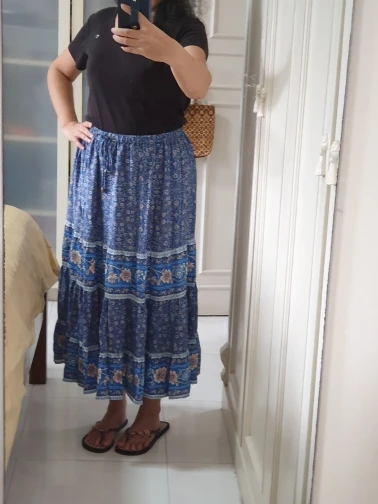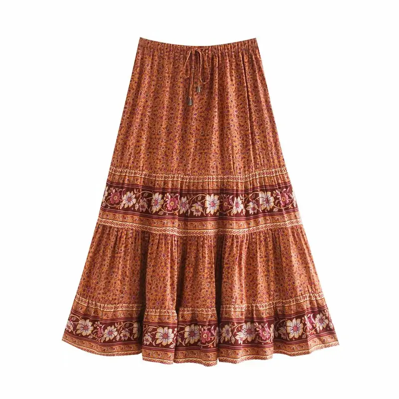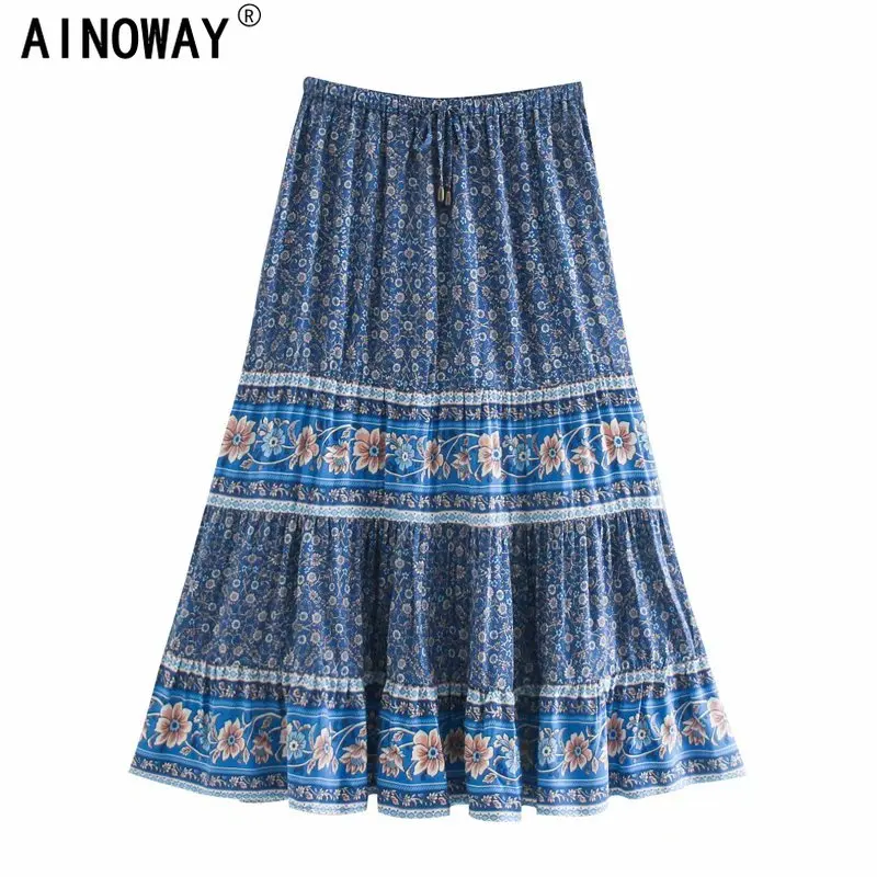 Винтажная шикарная Женская юбка в стиле хиппи с цветочным принтом и высокой эластичной талией, Пляжная богемная юбка из искусственного хлопка, трапециевидная юбка миди в стиле бохо