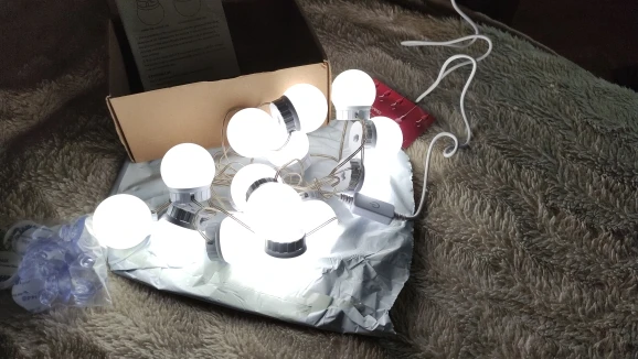 Очень приятно , что посылка доставлена за короткий срок . Упакована посылка вполне хорошо, но все равно ее очень сильно помяли при перевозке, пластиковые лампочки при этом никаких повреждений не получили. Теперь о самих лампочках, крутые , света очень много, при этом он приглушённый , не очень слепит, удобно регулируется расстояние между лампочками, шнур достаточно длинный для того чтобы подключиться к розетке, в комплекте идёт два вида крепления: присоски и двусторонний скотч. Я присоски не пробовала установить, сразу клеила на скотч двухсторонний так как присоски мне показались не очень надёжными, побоялась что могут отвалиться. Конечно же очень довольна лампочками, великолепные, в ванной комнате не хватало света, теперь просто огонь, в зеркало смотреться одно удовольствие